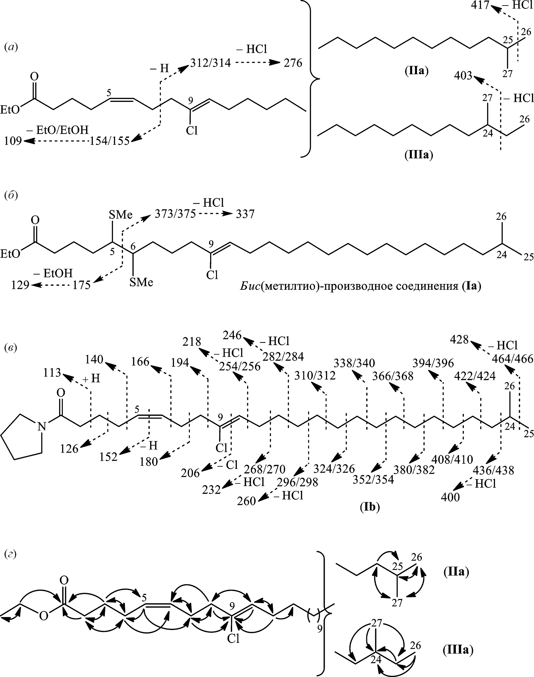 Гидрирование производных кислот (I–IV) над катализатором Адамса сопровождалось дегалогенированием, в результате чего эти вещества превращались в известные насыщенные соединения. Так, пирролидид (Ib) подвергался дегалогенированию до соответствующего производного 24-метилпентакозановой кислоты, чей масс-спектр содержал диагностический пробел (28 а.е.м.) между пиками при m/z 406 и 434 [26]. Этиловые эфиры (IIа–IVа) при гидрировании трансформировались в этиловые эфиры 25-метилгексакозановой (эквивалентная длина цепи (ЭДЦ) 26.63), 24-метилгексакозановой (ЭДЦ 26.72) и 25-метилгептакозановой (ЭДЦ 27.72) кислот соответственно (согласно данным ГЖХ-МС-анализа). Элиминирование Cl при гидрировании могло указывать на его винильное (как в соединениях (I–IV)) или аллильное (как в соединениях (V–VII)) положения, т.к. дегалогенирование насыщенных хлорированных жирных кислот в использованных нами условиях гидрирования не происходило.