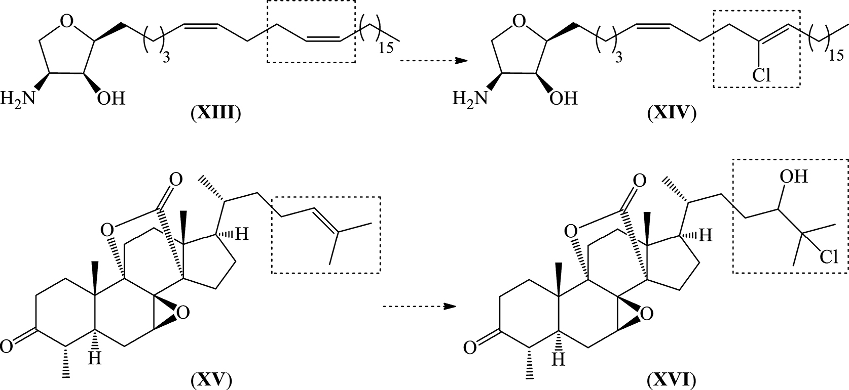 Рис. 4. Гипотетические пути образования хлорированных вторичных метаболитов (XIV) и (XVI), полученных из губок рода Penares.