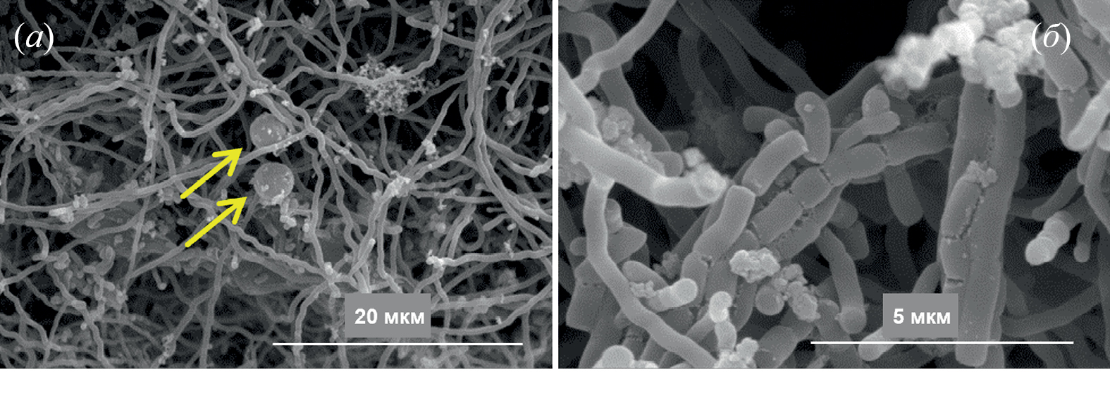 Микроморфологическая структура мицелиальных микроорганизмов (SM-1, SM-20), дрожжей (SM-6) и наиболее активного бактериального изолята (SM-11) была изучена с помощью SEM (рис. 2–5).