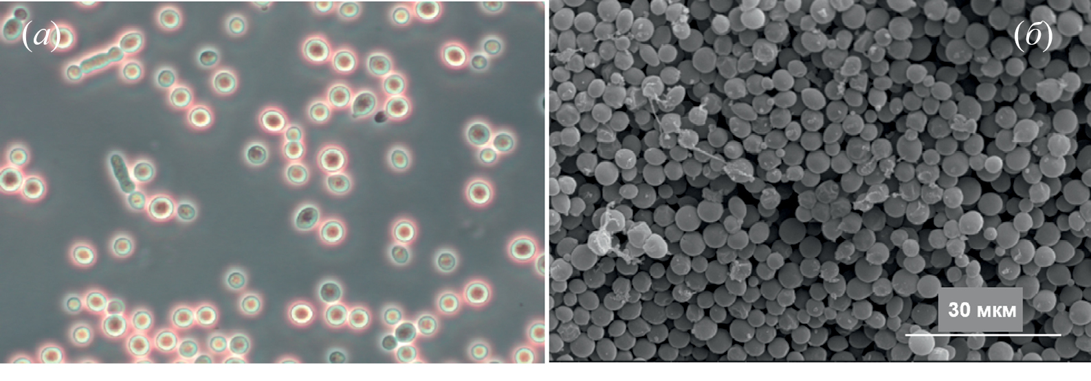 Рис. 3. Морфология Rhodotorula frigidialcoholis (SM-6): световая микроскопия (а), сканирующая электронная микрофотография после 3 сут инкубации на среде Мюллера–Хинтона при 28°C (б).