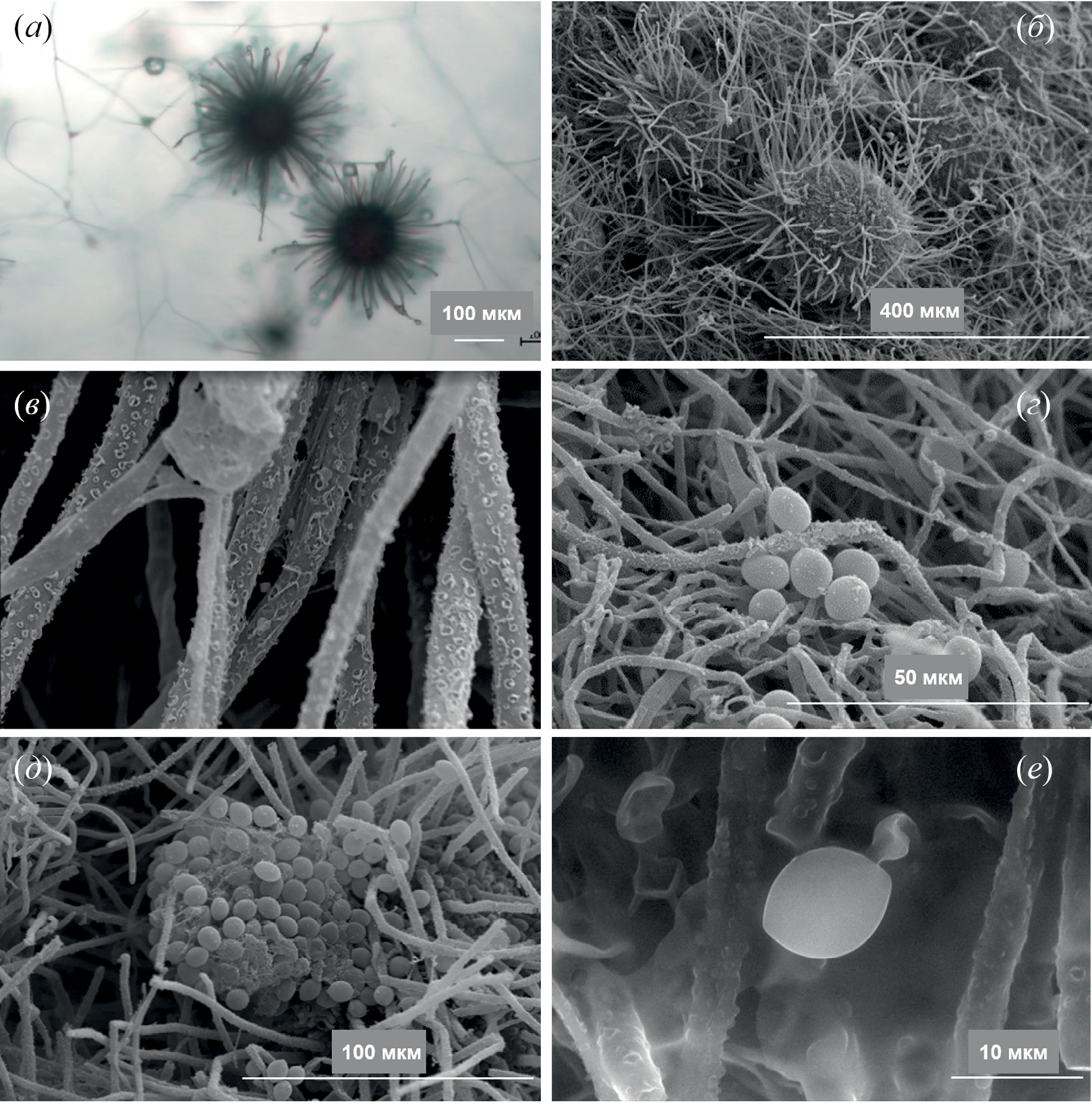 Рис. 5. Микроморфология Chaetomium anastomosans SM-20 на среде PDA через 7 сут инкубации при 25 ± 1°C: зрелые плодовые тела (перитеции), рассмотренные с помощью световой микроскопии (а) и сканирующего электронного микроскопа (б), волоски перитеция в SEM (в), аскоспоры в SEM (г) и в ESEM (д, е).