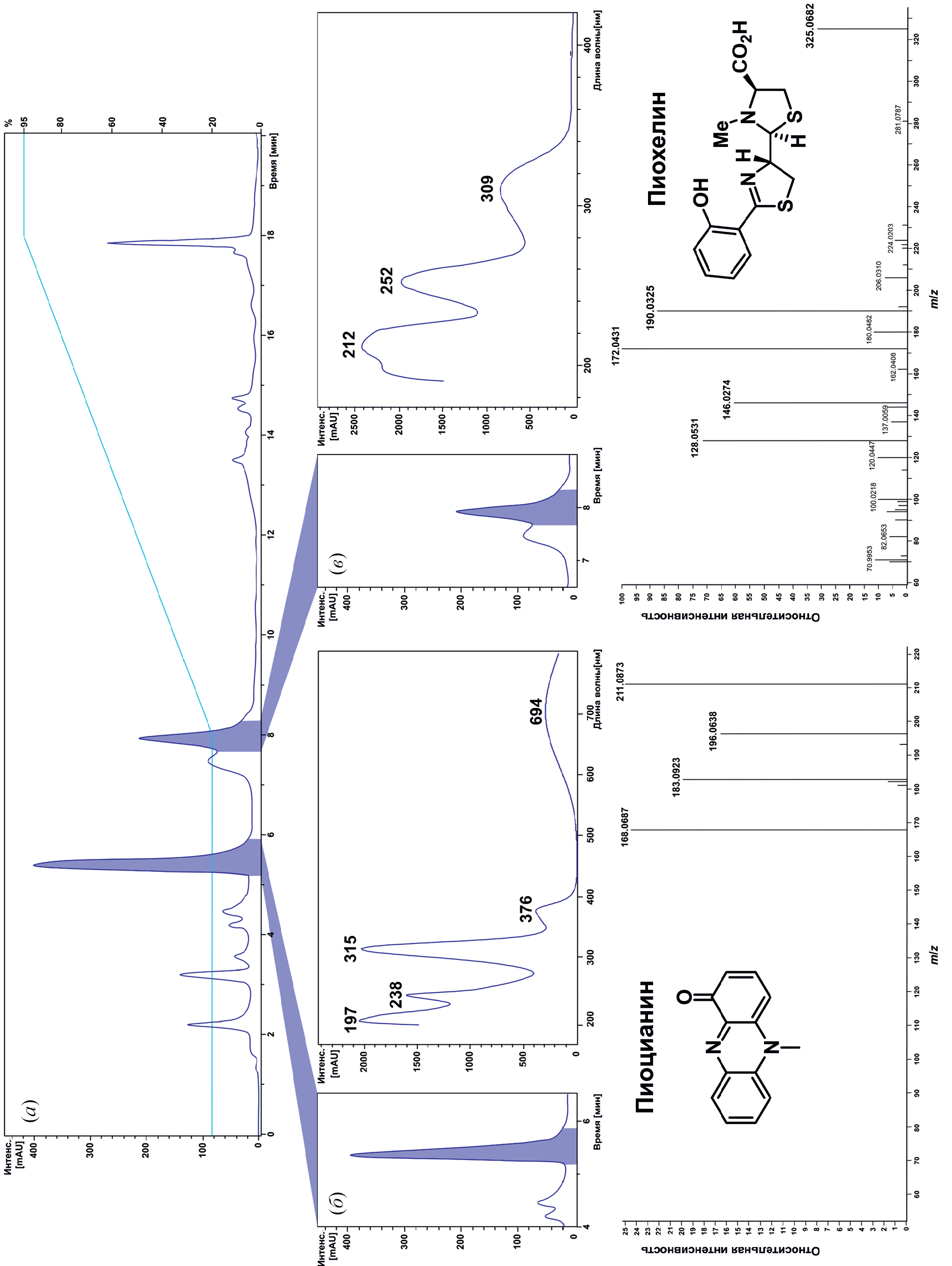 Рис. 6. Профиль ВЭЖХ (контролируется по УФ-поглощению при 350 нм) и условия элюирования (голубая линия) для SM-11-MeCN20 (а). УФ-спектры и картина фрагментации MS2 ([M + H]+, масс-спектр HCD в режиме регистрации положительно заряженных ионов) для пиоцианина (б) и пиохелина (в).