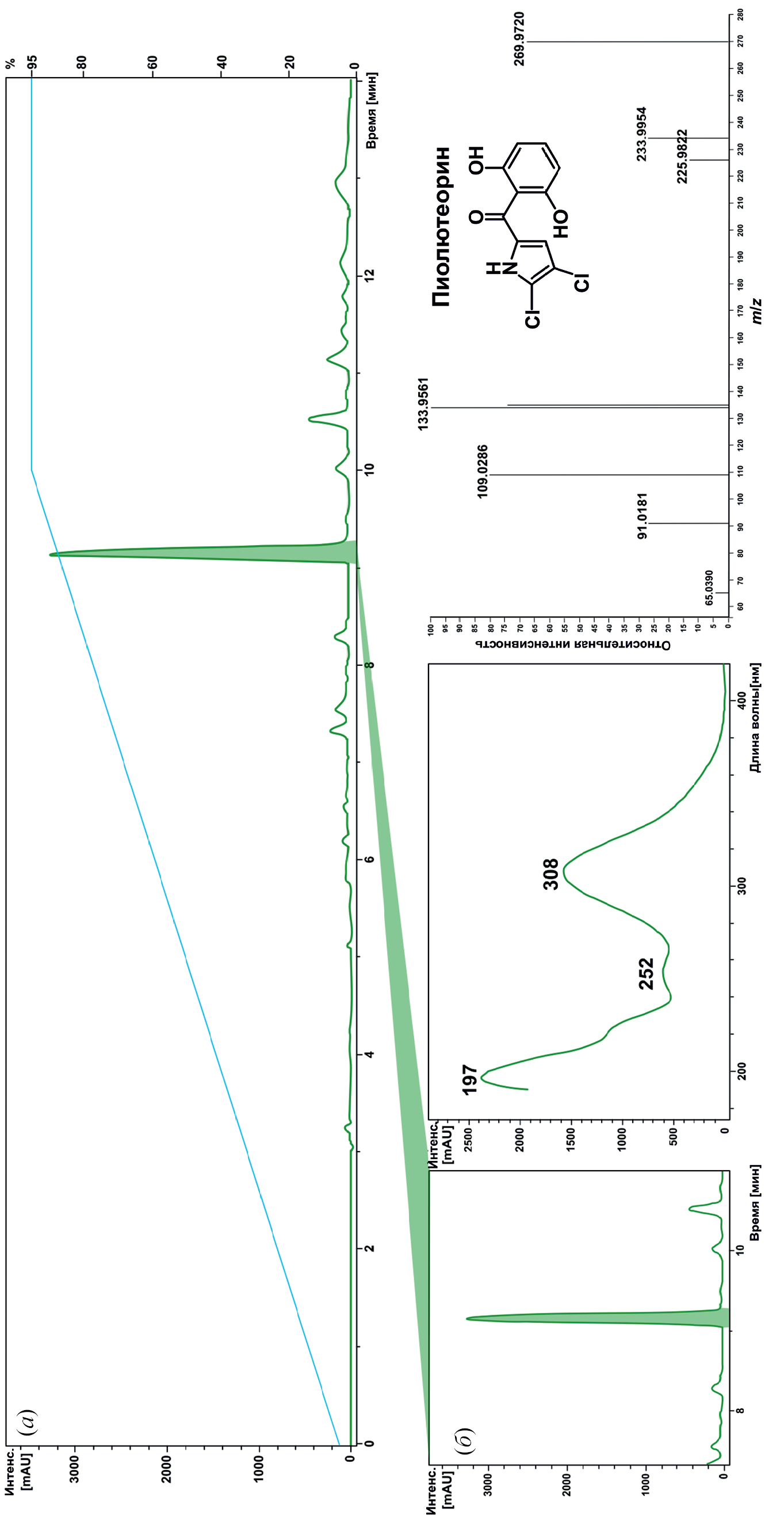 Следующую антимикробную фракцию элюировали с колонки LPS-500H 50%-ным водным ацетонитрилом. Фракционирование с помощью ВЭЖХ и МС-анализ выявили известный антибиотик пиолютеорин (рис. 7). Пиолютеорин – хлорированное производное пиррола с антибиотической, противогрибковой и гербицидной активностью [42], характерной для Pseudomonas sp.