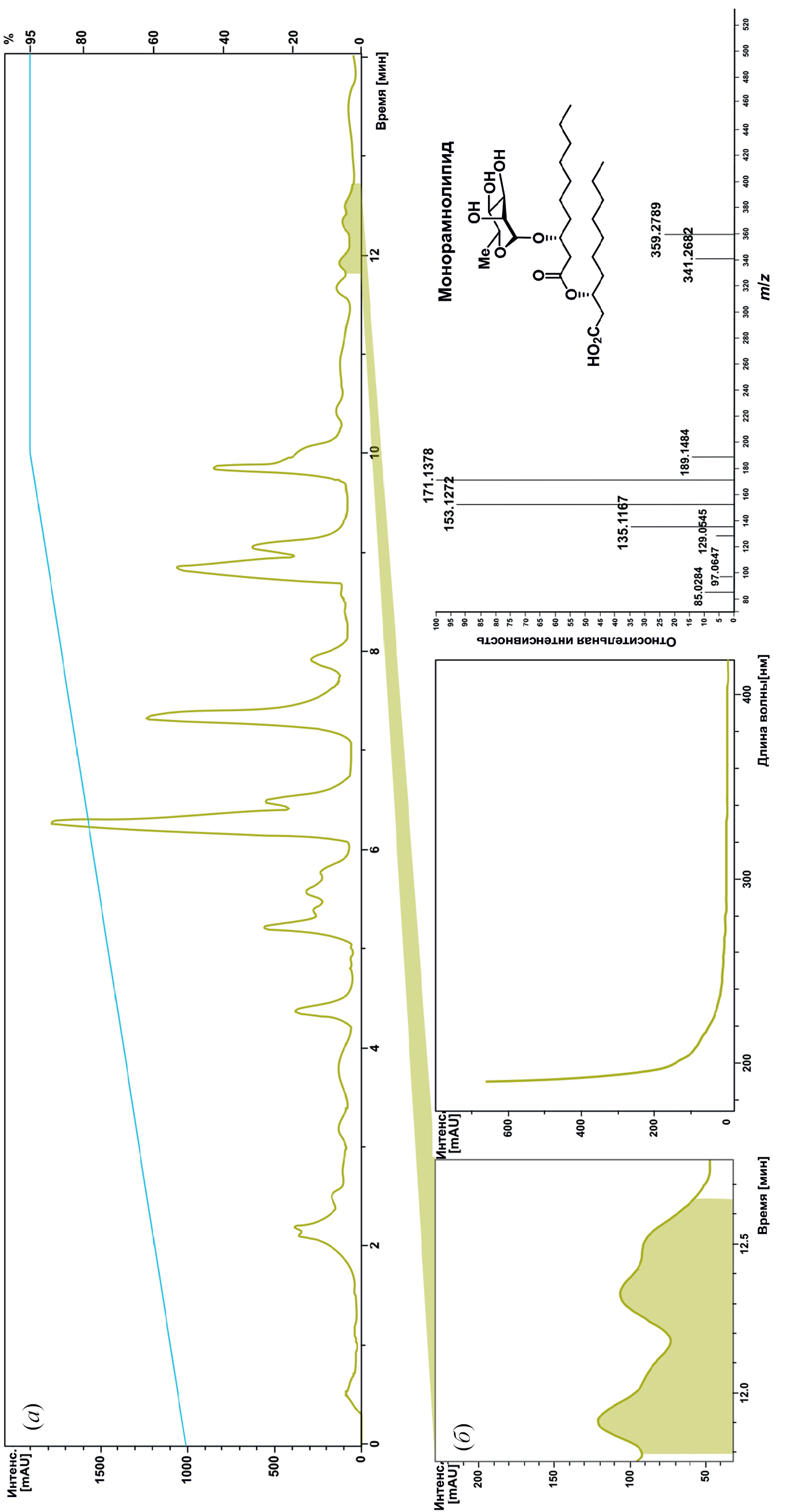 Рис. 8. Профиль ВЭЖХ (контролируется по УФ-поглощению при 210 нм) и условия элюирования (голубая линия) для SM-11-MeCN100 (а). УФ-спектр и схема фрагментации MS2 для монорамнолипида RhaC10C10 (б).