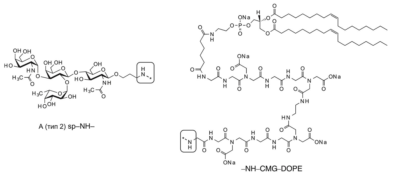 Данная работа посвящена получению двух бифункциональных СЛК. Оба конструкта содержат следующие структурные фрагменты (рис. 1): тетрасахарид А (тип 2) (Atetra (тип 2), гликан) и блок CMG–DOPE, где CMG – это N-карбоксиметилглициновый спейсер, а DOPE – это диолеоилфосфатидилэтаноламин (липид).