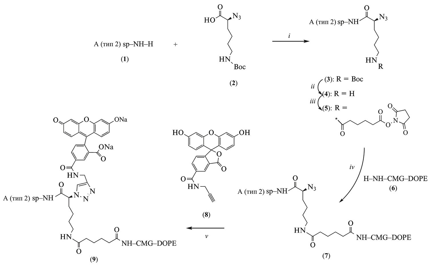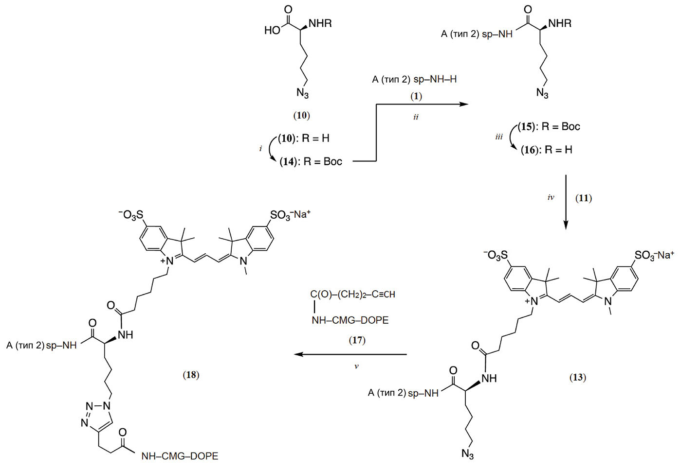 Тетрасахарид А (тип 2) (1) [25] и амин H2N–CMG–DOPE (6) [3] получали в лаборатории углеводов Института биоорганической химии им. академиков М.М. Шемякина и Ю.А. Овчинникова РАН по известным методикам. Производное (17) получали там же конъюгацией 4-пентиновой кислоты и амина (6) при помощи TBTU [17] и выделяли методом гель-фильтрации (описание синтеза будет опубликовано). Использовали коммерчески доступные производные лизина (2) и (10) (IRIS Biotech GmbH, Германия), флуоресцеина (8) и сульфоцианина-3 (11) (ООО “Люмипроб РУС”, Россия). Остальные реагенты также были коммерчески доступны (Acros Organics, США; SigmaAldrich, США). Растворители (Химмед, Реахим, Экос, Россия) перед использованием очищали стандартными методами.