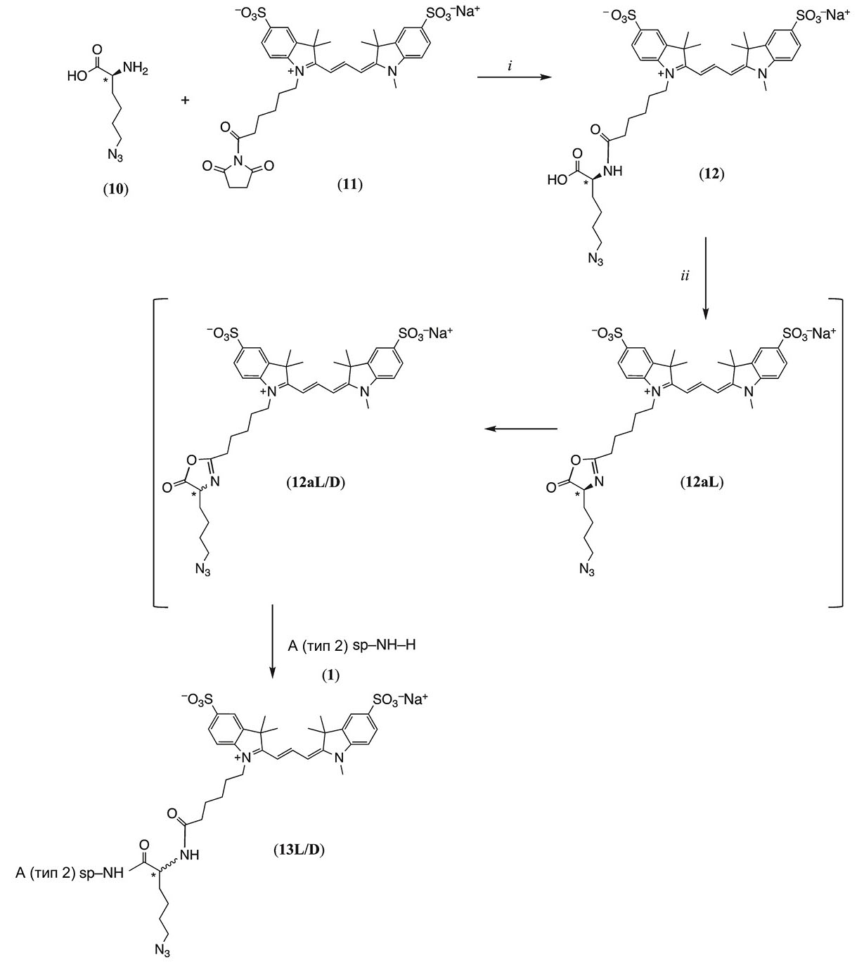 Конъюгация гликана и флуоресцентной метки с последующим введением спейсер-липида. Для второго пути получения бифункциональных СЛК в качестве центрального звена, к которому присоединяются все блоки, был выбран ε-азидолизин (10) (схема 2). В данном случае мы планировали сначала получить составную функциональную часть введением флуоресцентной метки и гликана по амино- и карбоксильной группам производного (10) соответственно, которую затем нужно было конъюгировать со спейсер-липидным блоком. В качестве флуоресцентной метки в данном случае был выбран сульфоцианин-3. Конъюгация активированного эфира сульфоцианина-3 (11) с ε-азидолизином (10) приводила к получению производного (12) с выходом 85%. Следующий шаг – введение углеводного фрагмента, для чего карбоксильную группу в соединении (12) активировали TBTU и вводили в реакцию с аминопропилгликозидом тетрасахарида А (тип 2) (1). Было обнаружено, что в ходе этой конъюгации происходил побочный процесс – рацемизация остатка лизина, поэтому полученный таким путем продукт (72%) представлял собой смесь L- и D-изомеров с соотношением 1 : 1 (13L/D). Об этом свидетельствовали данные 1H-ЯМР-спектроскопии: в спектре (13L/D) протон в α-положении лизина, а также некоторые сигналы тетрасахаридного фрагмента (Н1 и ацетильная группа звена GlcNAc, CH3-группа α-L-фукозы) проявлялись в виде пар идентичных сигналов с соотношением интегральных интенсивностей 1 : 1. Рацемизация аминокислот при активации их карбоксильных групп действием как TBTU, так и других реагентов, описана в литературе [24]. Предполагается, что она протекает через образование циклического азлактона (12a) (схема 2), в котором α-протон обладает повышенной кислотностью, что и способствует образованию смеси изомеров (12аL/D) и далее диастереомеров (13L/D).