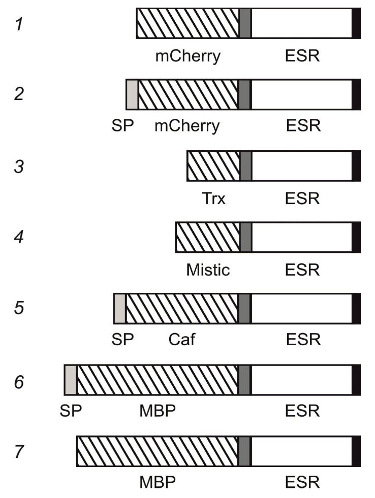 Конструирование и экспрессия гибридных генов. Для получения гибридных полипептидов, включающих ESR и N-концевые растворимые домены, мы провели клонирование генов нескольких белков-партнеров, ранее использованных для повышения уровня продукции и растворимости мембранных белков в клетках бактерий и бесклеточных системах экспрессии. Известно большое число работ, в которых с этой целью применяли тиоредоксин и мальтозосвязывающий белок (MBP) E. coli, а также белок Mistic Bacillus subtilis [38–41]. В частности, MBP обладает способностью не только существенно повышать выход рекомбинантных белков, но и облегчает их сворачивание [42, 43]. Описано успешное получение гибридных белков, включающих MBP и рецепторы, сопряженные с G-белком [44, 45], а также бактериородопсин [40]. В некоторых работах были использованы конструкции, кодирующие зрелый MBP [40, 46], в других – кодирующие белок-предшественник, содержащий природный сигнальный пептид [44, 45].