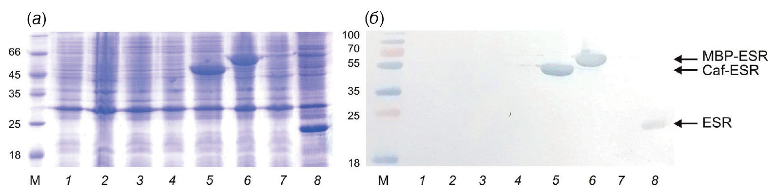 Рис. 2. Экспрессия гибридных белков, содержащих ESR, в клетках E. coli. Белковый электрофорез в 13%-ном SDS-ПААГ (а) и вестерн-блот-анализ (б) с анти-His-конъюгатом образцов мембранной фракции клеток E. coli С43(DE3), экспрессирующих гибридные белки (дорожки 1–7) и ESR дикого типа (дорожка 8). Номера дорожек 1–7 соответствуют нумерации конструкций на рис. 1. М – маркеры молекулярного веса белков (кДа).