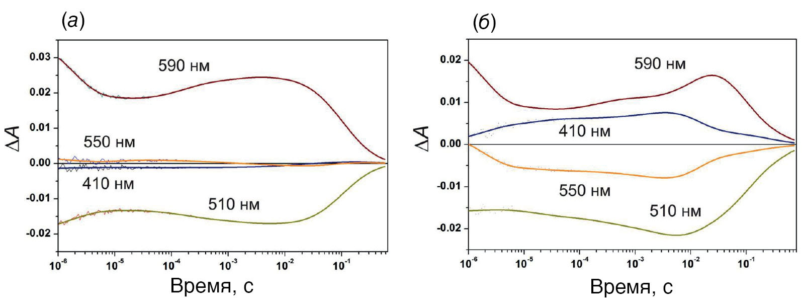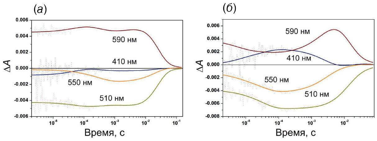 Рис. 5. Кинетика светоиндуцированных изменений поглощения при характерных длинах волн протеолипосомами, содержащими MBP-ESR, при рН 7.5 (а) и 8.5 (б).