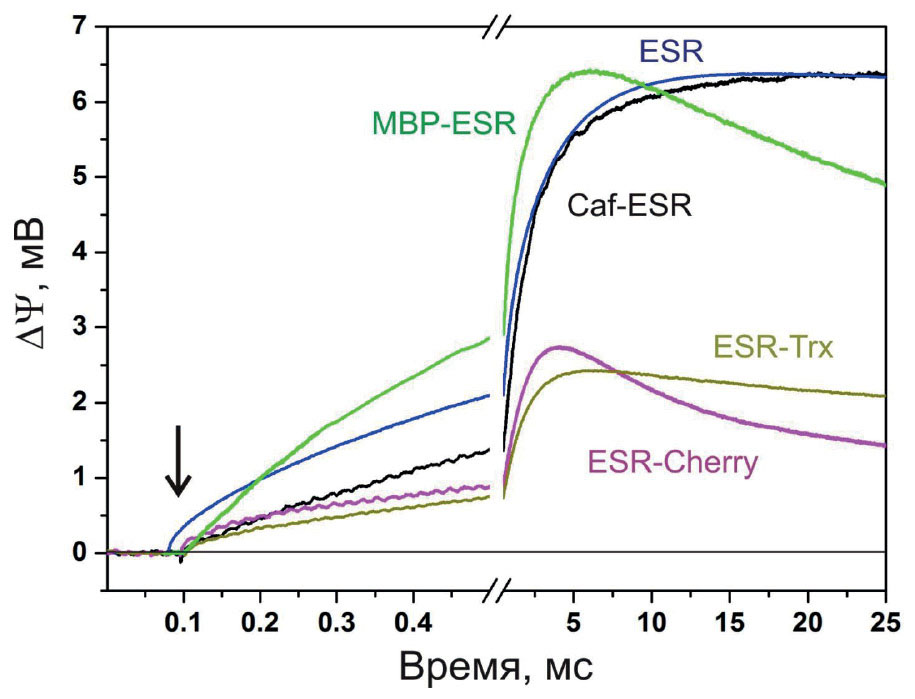 Ранее нами было показано, что фотоэлектрический ответ ESR включает микро- и миллисекундные фазы, в основном соответствующие депротонированию основания Шиффа, переносу протона на акцептор Asp85 и его репротонированию от донора Lys96 и высвобождению протона на внеклеточной стороне мембраны [34, 51, 53]. Фотоэлектрический ответ гибридных белков, содержащих ESR на N-конце (ESR-Cherry и ESRTrx), сопровождается существенным уменьшением общей амплитуды ответа, в особенности, электрогенных стадий в миллисекундном временном диапазоне [37] (рис. 4). Полученные данные свидетельствуют о значительной доле неправильно ориентированных молекул ретинального белка в мембране протеолипосом. Напротив, гибридные белки Caf-ESR [37] и MBP-ESR продемонстрировали фотоэлектрический ответ, сопоставимый по амплитуде с ответом ESR дикого типа (рис. 4), что указывает на их гомогенную ориентацию в протеолипосомах. Характерная особенность гибридов Caf-ESR и MBP-ESR – более медленная кинетика микросекундных электрогенных стадий, связанных с образованием интермедиата М. Кроме того, фотоэлектрический ответ MBP-ESR обнаруживает ускоренный спад потенциала в миллисекундной области, предположительно связанный с влиянием крупного растворимого домена. Эти особенности электрогенных реакций гибридного белка требуют более детального кинетического анализа, который будет проведен в последующей работе.