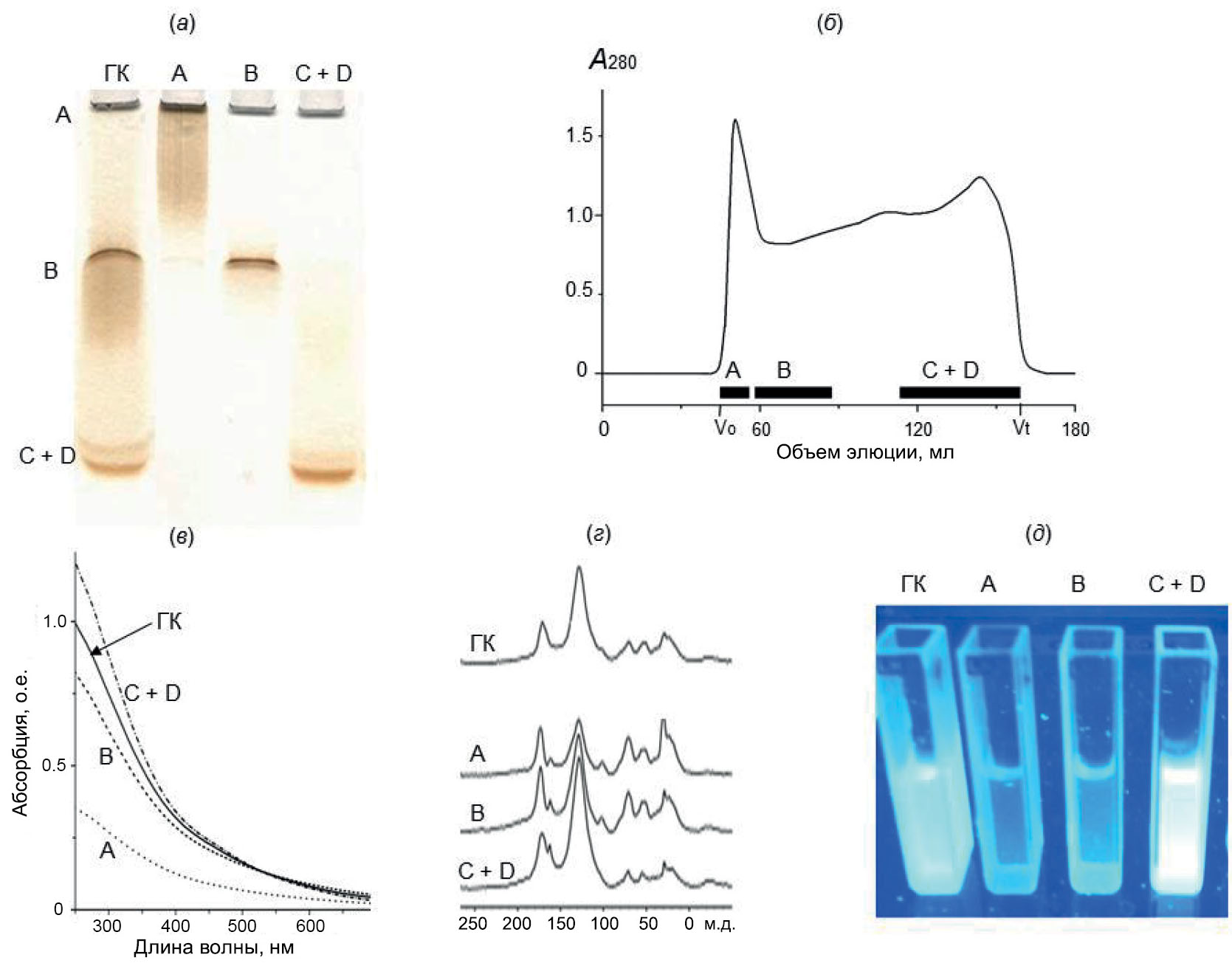 Рис. 1. Электрофорез ГК чернозема и фракций А, В, C + D в 10%-ном ПААГ (а); фракционирование ГК на колонке с сефадексом G-75 (б); спектры поглощения ГК и фракций при концентрации препаратов 20 мг/л (в); 13С-ЯМР-спектры (г) и распределение интенсивности флуоресценции препаратов при освещении УФ-светом длиной волны 312 нм (д).