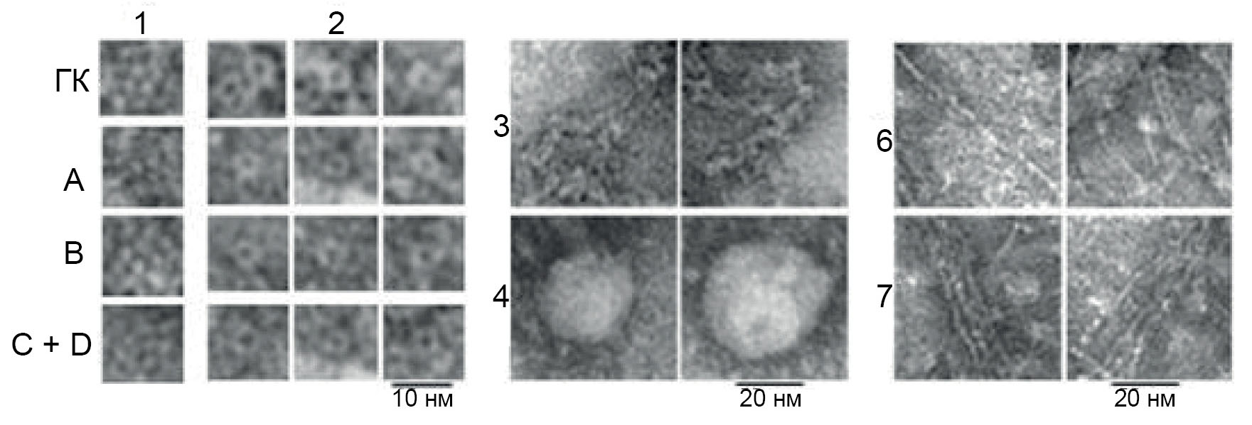 Рис. 3. ПЭМ-изображения точечных (1) и кольцевых (2) частиц на различных микрофотографиях препаратов ГК чернозема и фракций А, В, C + D; примеры червеподобных частиц (3), сфероидов (4), длинных фибрилл в двух разных проекциях (6), а также пучков длинных фибрилл (7).