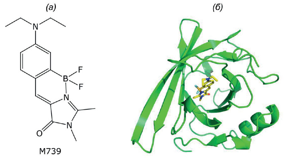Рис. 2. (а) – Структурная формула хромофора M739; (б) – пространственная структура комплекса липокалина (показан зеленым) с хромофором (показан желтым).
