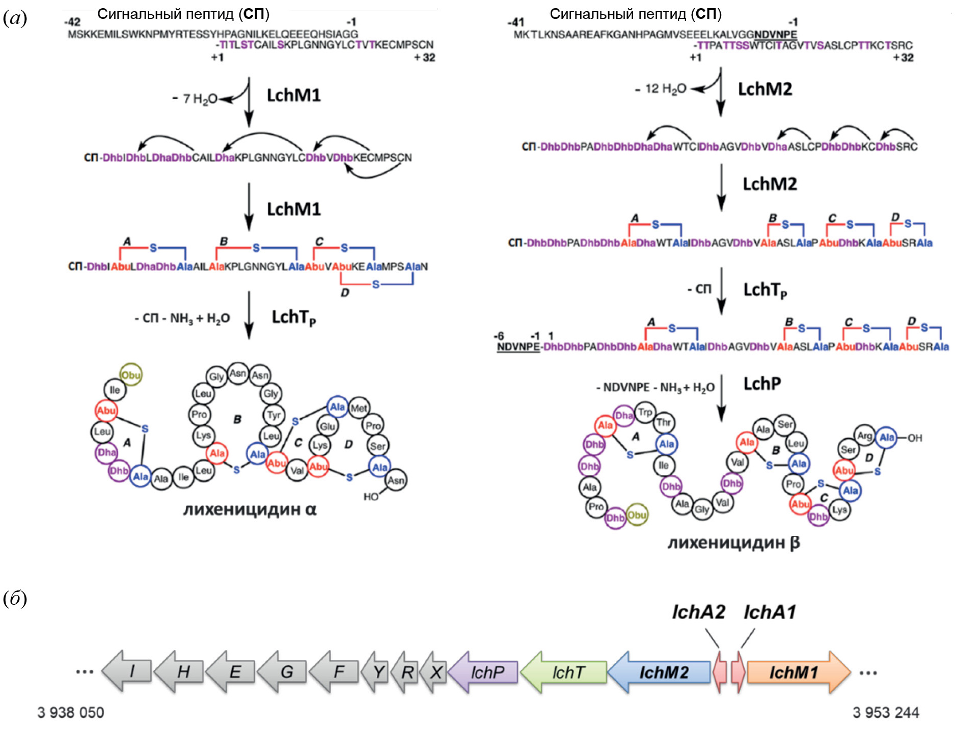 Рис. 1. (а) Схема биосинтеза и модификации компонентов лихеницидина [4]; (б) структурная организация кластера биосинтеза лихеницидина из B. licheniformis VK21 [12].