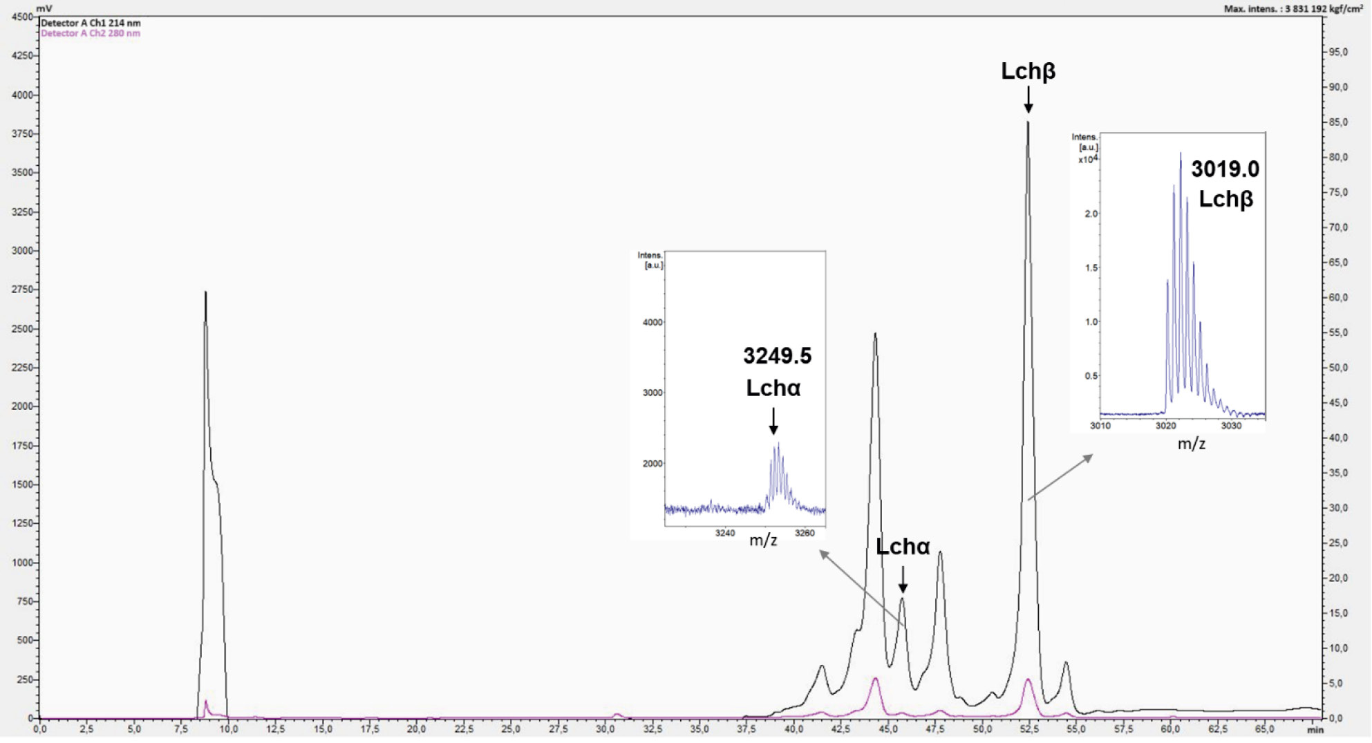 Для получения каждого из пептидов проводили трансформацию Ca2+-компетентных клеток E. coli BL21(DE3) соответствующей плазмидой и дальнейшую коэкспрессию каждого из предшественников компонентов лихеницидина и соответствующего ему модифицирующего фермента. При этом биосинтез, модификация и накопление компонентов происходили в цитоплазме клеток E. coli. Очистка включала в себя металлохелатную хроматографию в денатурирующих условиях, отщепление олигогистидиновой метки и сигнальной части пропептида с помощью реакции с бромцианом в кислой среде и разделение продуктов реакции с помощью офВЭЖХ. Важно отметить, что в ходе совместной экспрессии предшественника пептида с ферментом его модификации синтезировался набор модифицированных форм с разной степенью зрелости (с различным числом фосфорилированных и дегидратированных остатков и тиоэфирных связей), имеющих различные времена удерживания на колонке при разделении методом офВЭЖХ. Хроматограммы очистки рекомбинантных компонентов Lchα и Lchβ, а также масс-спектрометрический анализ фракций, предположительно содержащих целевые зрелые пептиды, представлены на рис. 3 и 4.