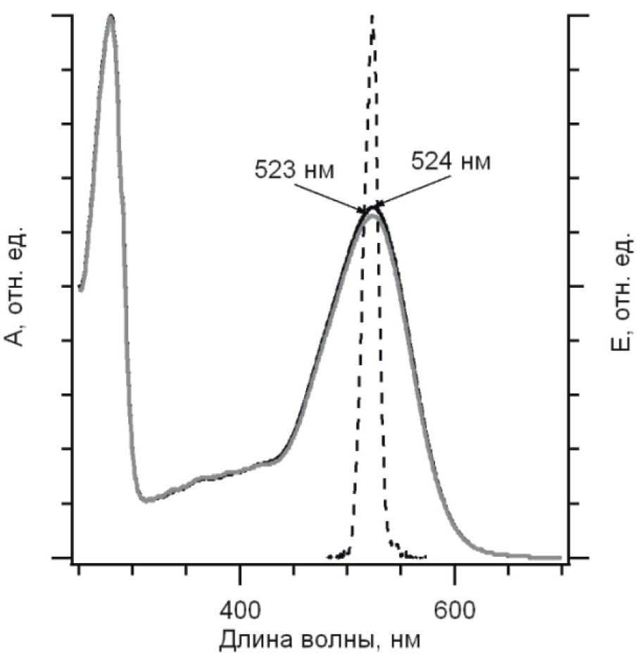 Рис. 2. Нормированные по γ-полосе спектры поглощения темноадаптированного (черная кривая) и светоадаптированного (серая кривая) образцов ESR в DDM с указанием максимумов поглощения. На рисунке также представлен спектр возбуждающего импульса, использованный в экспериментах с фемтосекундным временны́м разрешением (пунктирная кривая).
