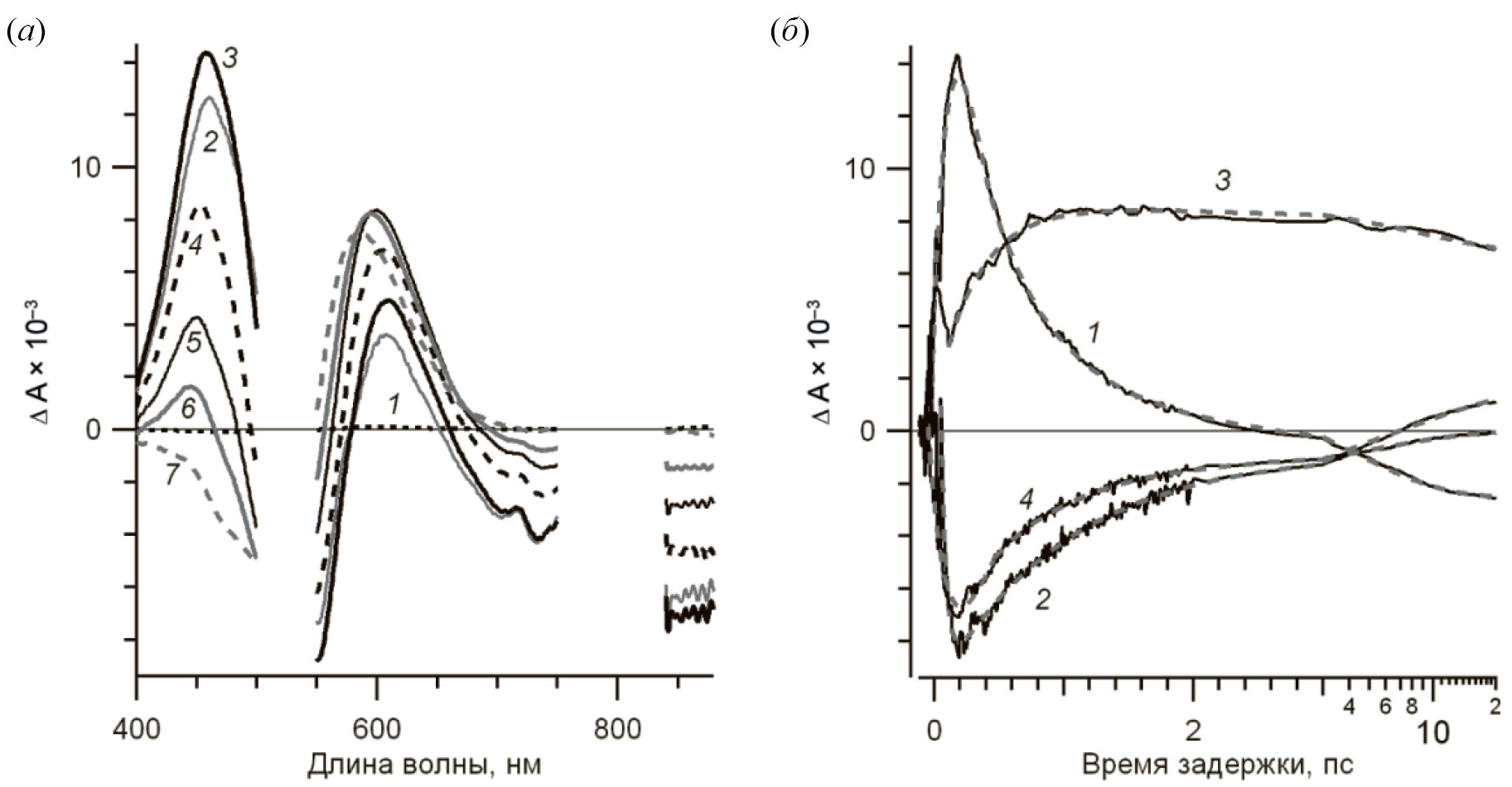 Рис. 3. (а) – Дифференциальные спектры фотоиндуцированного поглощения ESR в DDM, зарегистрированные на временах задержки –0.15 (1), 0.1 (2), 0.18 (3), 0.5 (4), 1 (5), 2 (6) и 20 (7) пс. В спектральных областях импульса возбуждения (λмакс = 523 нм) и исходного фемтосекундного импульса (λмакс = 802 нм) данные не приведены из-за интенсивного сигнала светорассеяния; (б) – кинетические кривые фотоиндуцированного поглощения ESR в DDM, зарегистрированные на длинах волн зондирования 460 (1), 550 (2), 600 (3) и 850 (4) нм. При времени задержки до 3 пс масштаб линейный, далее – логарифмический. Представлены также модельные экспоненциальные кривые (пунктирные кривые).