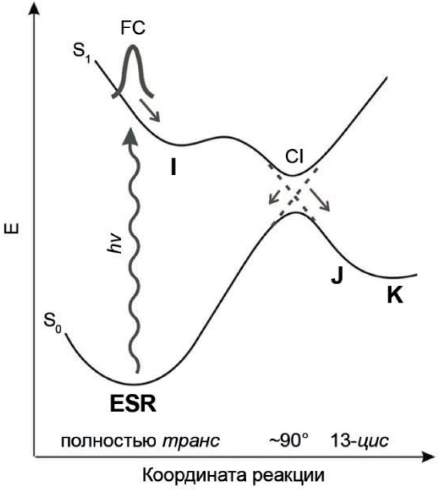 Рис. 4. Строение поверхностей потенциальной энергии ESR, демонстрирующее путь распада реакционного возбужденного состояния. Координата реакции представлена реакционными колебательными модами, отмечены полностью транс-, 13-цис- и промежуточная формы RPSB. FC – франк-кондоновское состояние, CI – коническое пересечение.