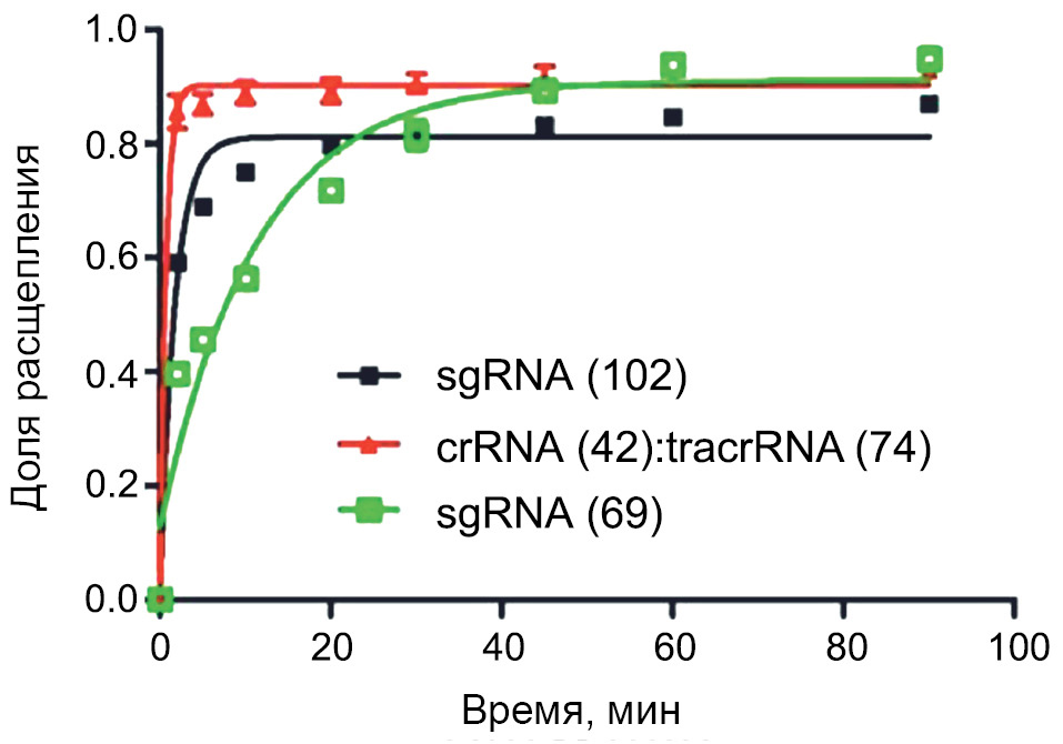 Укороченная 69-звенная sgРНК спустя 40 мин реакции позволила достичь 90%-ного расщепления мишени, как и пара направляющих crРНК⁻ tracrРНК. Однако при этом константа скорости расщепления для 69-звенного фрагмента оказалась значительно ниже (ksgРНК(69) = 0.09 ± 0.01 мин⁻¹, kcrРНК:tracrРНК = 1.47 ± 0.02 мин⁻¹, ksgРНК(102) = = 0.57 ± 0.01 мин⁻¹). Возможно, это связано с тем, что при использовании укороченной sgРНК доля продуктивного комплекса Cas9/РНК сравнима с долей продуктивного комплекса в присутствии полноразмерных направляющих РНК, но скорость расщепления значительно снижается из-за отсутствия дополнительных взаимодействий белка с 3'-концевыми шпильками tracrРНК или sgРНК.