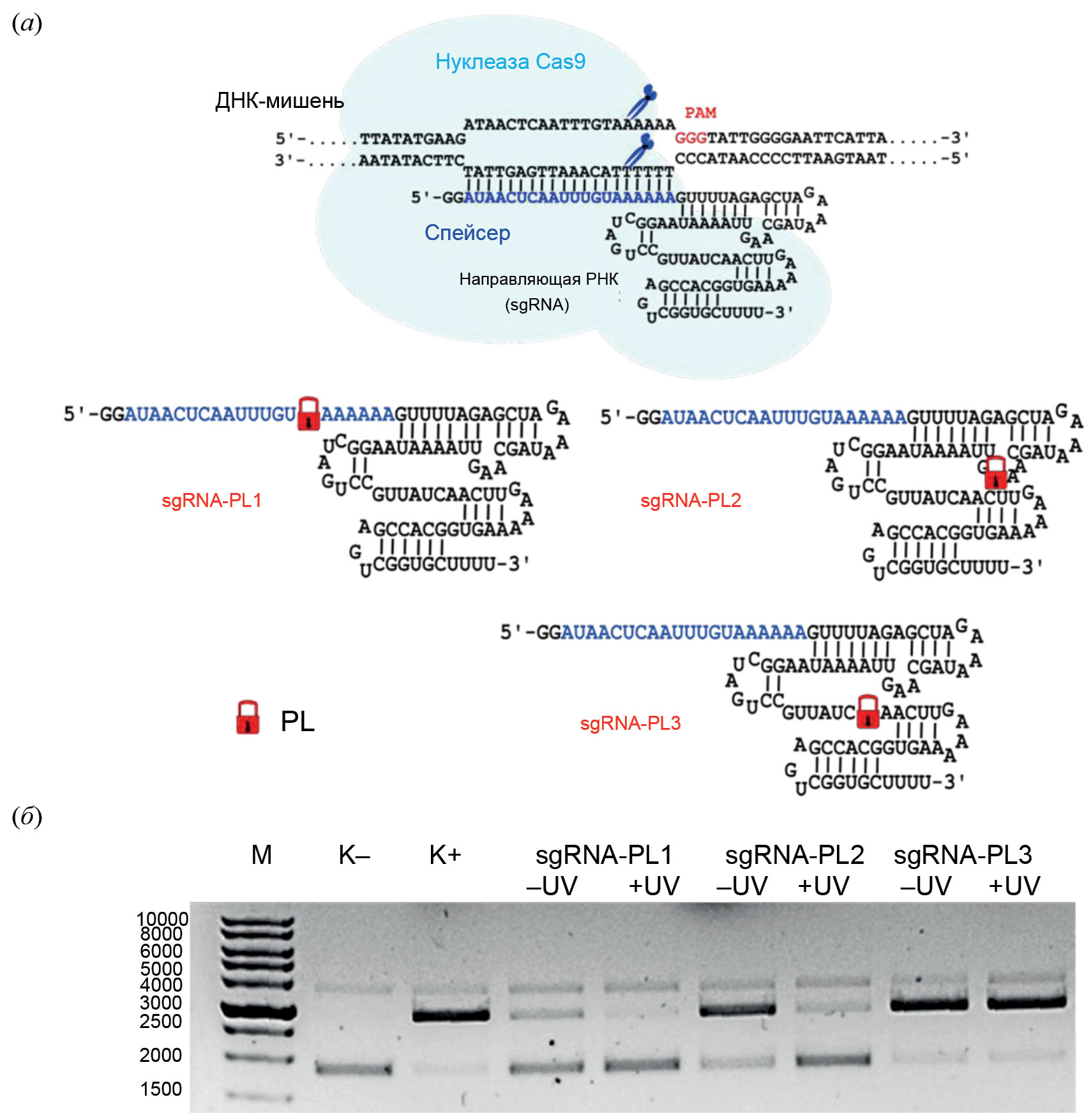 Рис. 1. Расщепление плазмиды pBluescriptII SK(−) системой CRISPR/Cas9. (а) – Схематическое изображение комплекса ДНК-мишени и немодифицированной sgРНК с белком Cas9 и последовательности фотолабильных направляющих РНК sgRNA-PL1, sgRNA-PL2 и sgRNA-PL3; (б) – электрофоретический анализ продуктов расщепления в 1%-ном агарозном геле. М – маркер длины ДНК, К⁻ – исходная кольцевая суперскрученная плазмидная ДНК-мишень, содержащая незначительное количество ДНК в релаксированной форме; К⁺ – продукты расщепления ДНК-мишени в присутствии немодифицированной химически синтезированной 102-звенной sgRNA; остальные дорожки – анализ продуктов расщепления ДНК-мишени в присутствии облученных (+UV) и необлученных (–UV) фотолабильных направляющих РНК (sgRNA-PL1, sgRNA-PL2 или sgRNA-PL3). Время реакции 60 мин, температура 37°C. Условия проведения реакции см. в “Эксперим. части”.