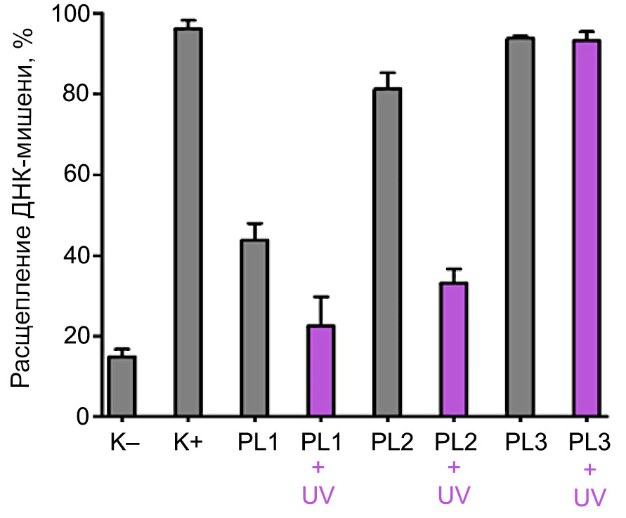 На первом этапе проводили сравнительное изучение способности фотомодифицированных и контрольных немодифицированных направляющих РНК индуцировать расщепление плазмидной ДНК-мишени pBluescriptII SK(−) белком Cas9. Плазмида pBS2SKM содержала протоспейсерную последовательность и PAM (5'-TGG-3'). В ходе эксперимента фотолабильные направляющие РНК sgRNA-PL1, sgRNA-PL2 и sgRNA-PL3 предварительно облучали УФ-светом (365 нм) в течение 30 мин. Длительность облучения подбирали так, чтобы происходило количественное расщепление PL в составе РНК. Затем использовали их в реакции направленного расщепления ДНК нуклеазой Cas9, при этом для сравнения исследовали также расщепление ДНК-мишени в присутствии необлученных фотолабильных направляющих РНК (рис. 1).