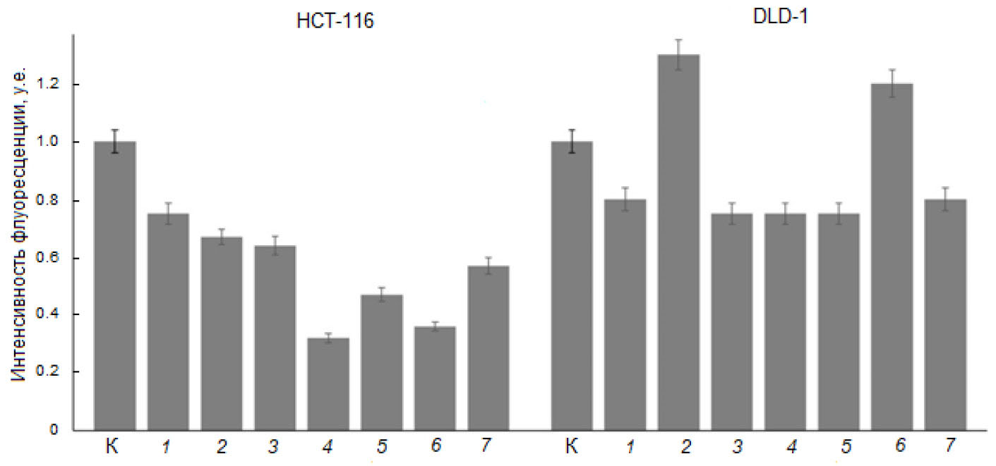 Рис. 2. Количественная характеристика интенсивности перекисного окисления липидов в клетках НСТ-116 и DLD-1. К – интенсивность флуоресценции, индуцированная эрастином, 1–7 – соединениями (VIIa–g) соответственно. Данные представлены как среднее значение ± стандартное отклонение, р < 0.05.