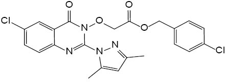 4-Хлорбензил 2-((2-(3,5-диметокси-1H-пиразол-1-ил)-6-хлор-4-оксохиназолин-3(4H)-ил)окси)ацетат (VIIa). Выход 155 г (65.7%), белые кристаллы, т. пл. 108–109°С. Спектр 1H-ЯМР (DMSO-d6): 8.12 (д, J 2.4, 1H), 7.92 (дд, J 8.8, J 2.5, 1H), 7.73 (д, J 8.7, 1H), 7.49–7.34 (м, 4H), 6.15 (с, 1H), 5.17 (с, 2H), 5.15 (с, 2H), 2.41 (с, 3H), 2.09 (с, 3H). 13C-ЯМР (DMSO-d6): 166.23, 157.53, 150.34, 143.23, 142.70, 135.04, 134.50, 132.84, 131.77, 129.93, 129.59, 128.39, 125.32, 123.65, 108.04, 73.57, 65.13, 40.34, 13.08, 11.58. HRMS: m/z 473.0784 [M]+. Вычислено для (C22H19Cl2N4O4)+: 473.0782.