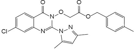 4-Метилбензил 2-((2-(3,5-диметокси-1H-пиразол-1-ил)-7-хлор-4-оксохиназолин-3(4H)-ил)окси)ацетат (VIIc). Выход 125 г (55.2%), белые кристаллы, т. пл. 91–92°С. Спектр 1H-ЯМР (DMSO-d6): 8.17 (д, J 8.6, 1H), 7.79 (д, J 2.0, 1H), 7.64 (дд, J 8.6, J 2.0, 1H), 7.30–7.13 (м, 4H), 6.16 (д, J 1.0, 1H), 5.13 (д, J 2.0, 4H), 2.42 (д, J 0.9, 3H), 2.30 (с, 3H), 2.10 (с, 3H). Спектр 13C-ЯМР (CDCl3): 166.68, 158.74, 151.90, 146.07, 144.12, 143.71, 141.53, 138.62, 132.29, 129.47, 128.75, 128.66, 128.27, 127.52, 120.89, 108.92, 74.05, 67.04, 21.40, 13.68, 12.36. HRMS: m/z 453.1332 [M]+. Вычислено для (C23H22ClN4O4)+: 453.1328.