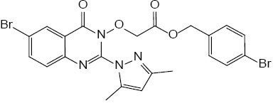 4-Бромбензил 2-((6-бром-2-(3,5-диметил-1H-пиразол-1-ил)-4-оксохиназолин-3(4H)-ил)окси)ацетат (VIIf). Выход 120 мг (53.3%), белые кристаллы, т. пл. 135–137°С. Спектр 1H-ЯМР (DMSO-d6): 8.26 (д, J 2.4, 1H), 8.04 (дд, J 8.7, J 2.4, 1H), 7.65 (д, J 8.7, 1H), 7.58 (д, J 8.3, 2H), 7.40–7.23 (м, 2H), 6.16 (с, 1H), 5.15 (д, J 3.5, 4H), 2.41 (с, 3H), 2.09 (с, 3H). Спектр 13C-ЯМР (CDCl3): 166.51, 158.17, 151.87, 143.97, 143.70, 143.24, 138.46, 134.31, 131.99, 130.23, 129.81, 123.84, 122.84, 121.51, 108.84, 74.04, 66.25, 13.67, 12.31. HRMS: m/z 560.9781 [M]+. Вычислено для (C22H19Br2N4O4)+: 560.9773.