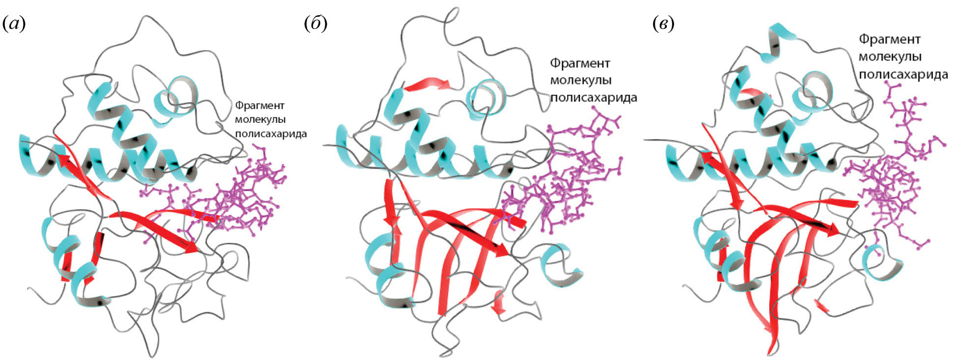 Для того чтобы установить причины снижения каталитической активности ферментов в комплексах с привитым сополимером, нами были проведены соответствующие расчеты методом молекулярного докинга. На рис. 3 представлена топология образующихся комплексов ХТЗ-ДМАЭМА–цистеиновая протеаза. Как видно из представленных данных, во всех случаях лиганды располагаются непосредственно в каталитическом кармане глобул фермента, при этом из-за объемности полисахарида он выходит за пределы щели между доменами. Особенно ярко это проявляется в случае фицина (рис. 3в): в его глобуле пространство между доменами более узкое и вытянутое по сравнению с бромелином и папаином. В результате этого над активным центром ферментов образуется плотное “покрытие” из модифицированного полисахарида, создающее диффузионные затруднения для продвижения высокомолекулярного субстрата – азоказеина – к активному центру цистеиновой протеазы, что приводит к снижению ее каталитической активности.