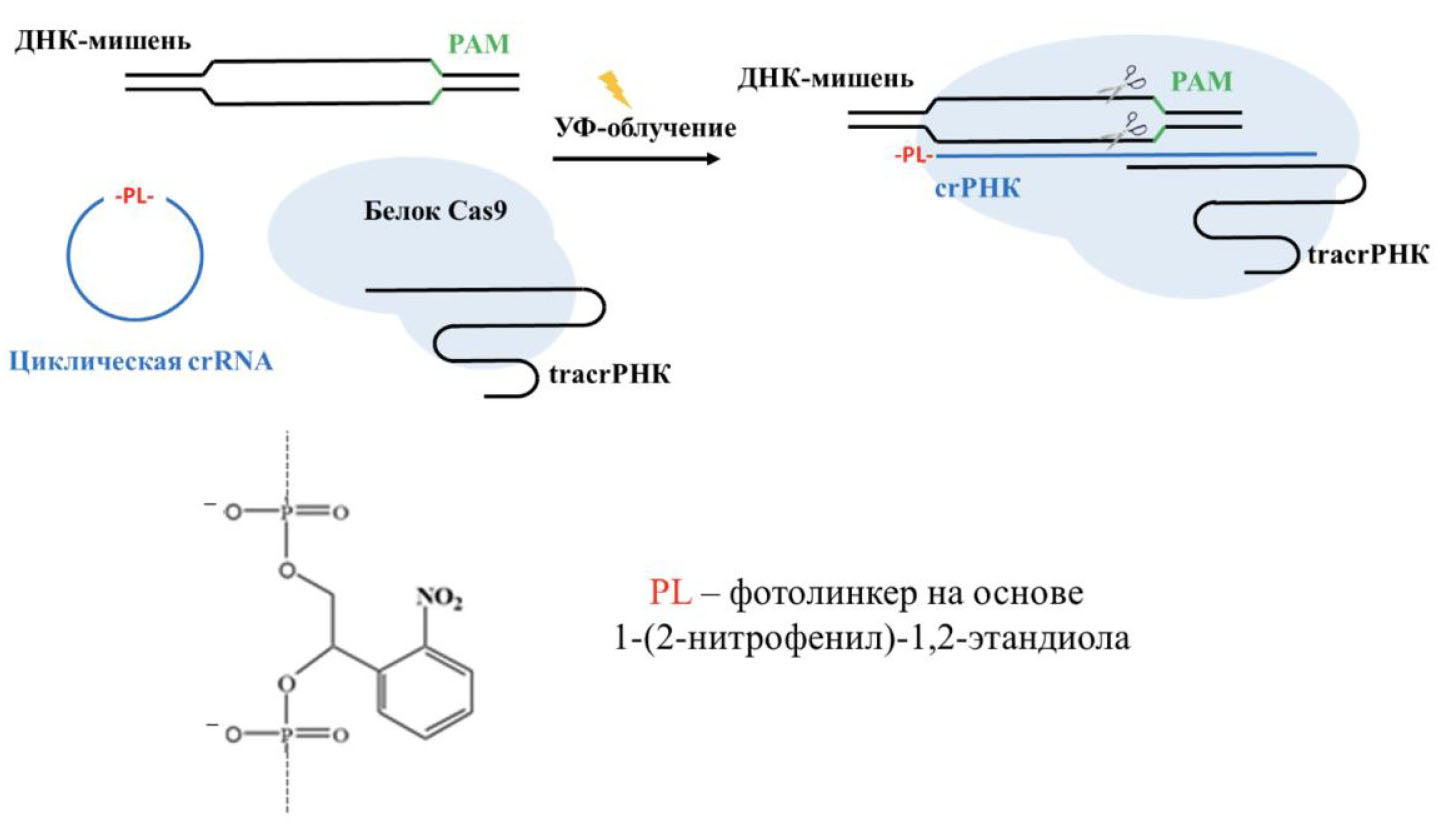 Цель данной работы заключалась в получении циклических (замкнутых) направляющих РНК для системы CRISPR/Cas9, содержащих фоторасщепляемый линкер. Такие направляющие РНК должны быть неактивны вплоть до облучения, а в результате облучения расщепление фотолинкера должно вызывать переход направляющей РНК в линейную форму и активацию системы геномного редактирования (рис. 1).