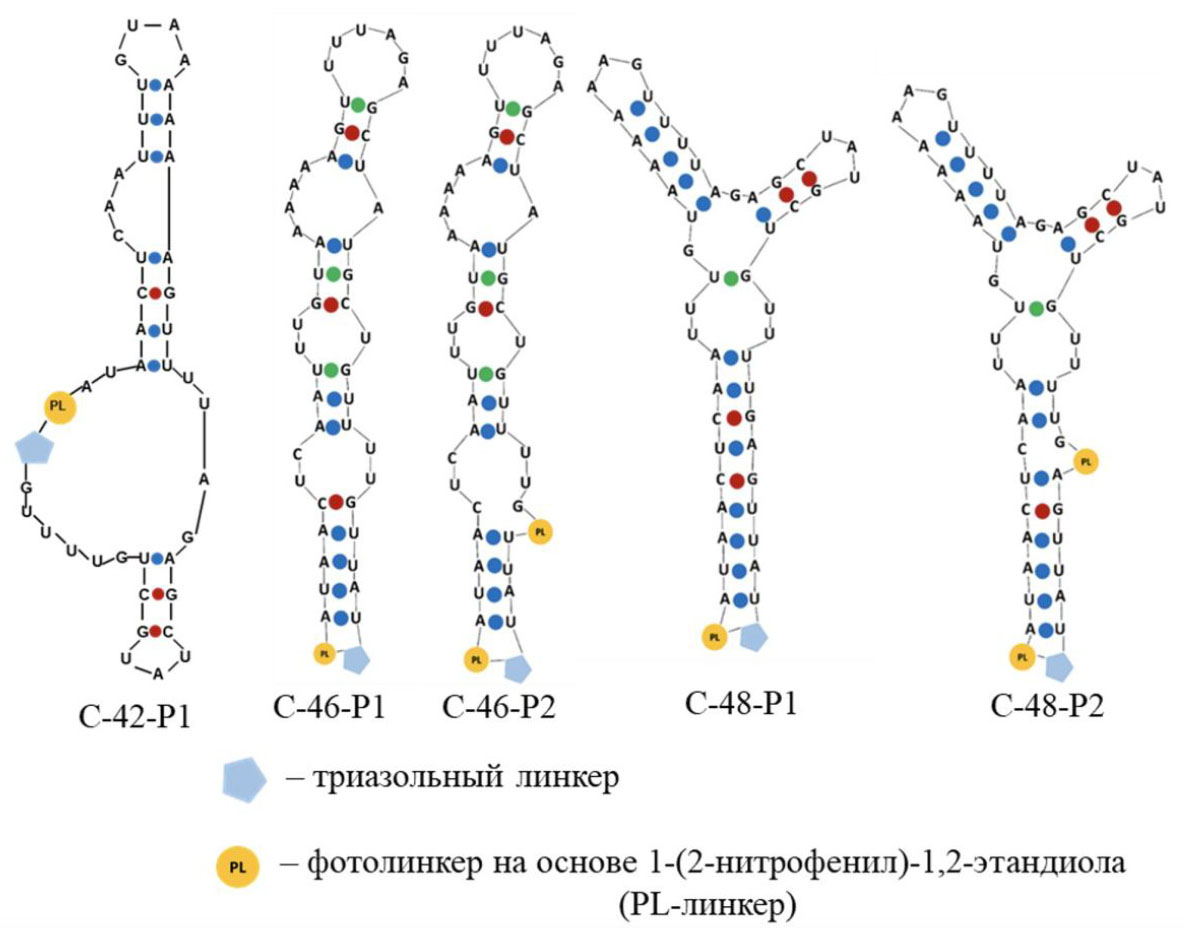 Локализация фоторасщепляемых линкеров в молекуле РНК была выбрана таким образом, чтобы происходили линеаризация циклической РНК и выщепление дополнительных нуклеотидов с 3′-конца (только в варианте с двумя PL-линкерами) при облучении УФ-светом.