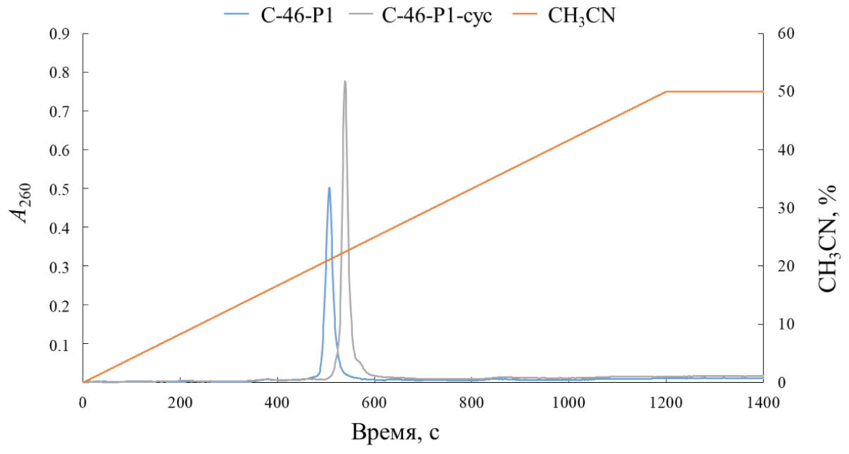 Рис. 3. Профиль офВЭЖХ выделенных продуктов циклизации, соответствующих исходному линейному олигонуклеотиду (голубой) и циклической crРНК (серый). Хроматографию проводили в градиенте концентрации 0–50% CH3CN в 0.02 М триэтиламмонийацетате (pH 7.0). Время выхода пика циклического продукта С-46-Р1-cyc составило 571 с, исходного линейного 5′,3′-модифицированного олигорибонуклеотида C-46-P1 – 539 с.