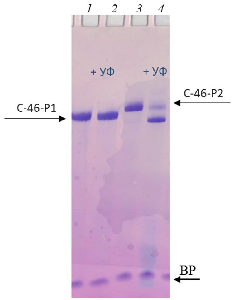 Рис. 4. Расщепление циклических РНК С-46-Р1 и С-46-Р2 под действием УФ-облучения. Электрофоретический анализ в 15%-ном денатурирующем ПААГ: 1 – циклический С-46-Р1, 2 – УФ-облученный циклический С-46-Р1, 3 – циклический С-46-Р2, 4 – УФ-облученный циклический С-46-Р2. Длина волны облучения – 365 нм, время облучения – 30 мин. Визуализацию РНК в геле проводили окрашиванием раствором красителя Stains-all. ВР – бромфеноловый синий.
