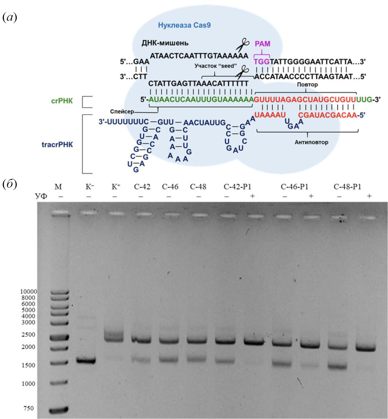 Рис. 5. (а) – Схематическое изображение активного комплекса CRISPR/Cas9; (б) – электрофоретический анализ расщепления плазмидного субстрата. М – набор маркеров длины дцДНК, K– – контроль, содержащий плазмиду без фермента, К+ – плазмида после расщепления нуклеазой Cas9 с немодифицированной crРНК. УФ: знак “–” означает отсутствие облучения, знак “+” – облучение УФ-светом в течение 30 мин при 365 нм.