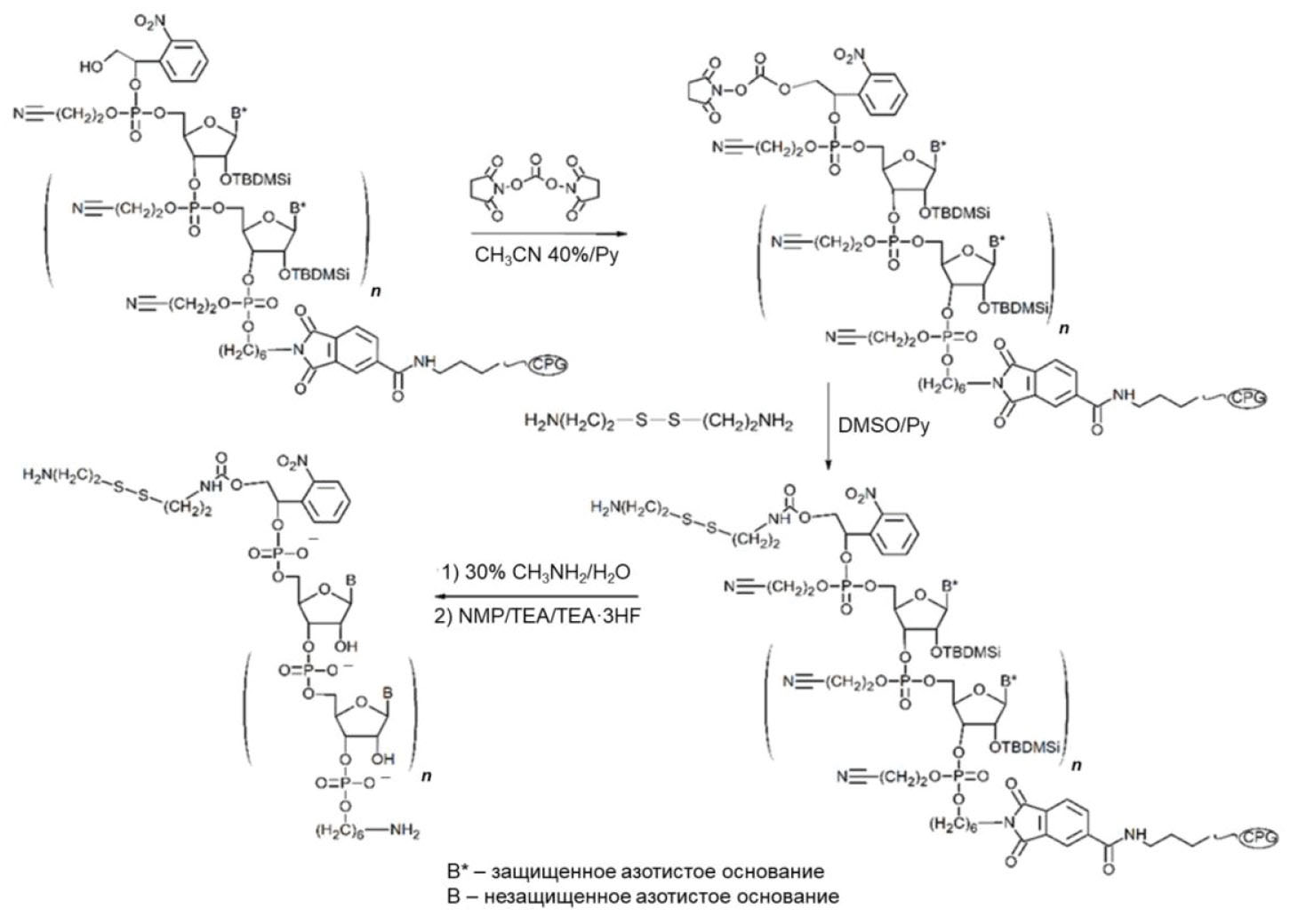 Реактивы. В работе были использованы следующие реактивы: N,N′-дисукцинимидилкарбонат, N-метилимидазол, пропионовый ангидрид, дитиотреитол (Acros Organics, США); 2-цианоэтил-N,N,N′,N′-тетраизопропилфосфитамид, 5′-O-(4,4′-диметокситритил)-дезоксириботимидин, 5′-O-(4,4′-диметокситритил)-N-ацетил-защищенные 2′-O-трет-бутилдиметилсилил-рибонуклеозид-3′-фосфитамиды, а также твердофазные носители с присоединенным первым нуклеозидным звеном: 5′-О-(4,4′-диметокситритил)-2′-О-трет-бутилдиметилсилил-N2-изопропилфеноксиацетилгуанозин-CPG и 5′-О-(4,4′диметокситритил)-2′-О-трет-бутилдиметилсилилуридин-CPG (ChemGenes, США); полимерный носитель с присоединенным N-(6-(O-диметокситритил)-гексил)-(2-карбоксамид)-фталимид-CPG (3′-PT-Amino-Modifier C6 CPG), 6-(2N-метил-1N-фталимидил)-гексил-1-[(2-цианоэтил)-(N,N-диизопропил)]фосфитамид (5′-Amino-Modifier C6-PDA) (Glen Research, США); краситель Stains-all, персульфат аммония, дихлоруксусная кислота, акриламид, N,N′-метиленбисакриламид, 2,6-лутидин, бромистый этидий, солянокислый цистеин, трисгидроксиметиламинометан, диметилсульфоксид (Fluka, Швейцария); мочевина, 40%-ный водный раствор метиламина (Merck, Германия); агароза (MP Biomedicals, США); пиридин, ацетон, тетрагидрофуран (PanReac, Испания); ксиленцианол FF, бромфеноловый синий, N,N,N′,N′-этилендиаминтетрауксусная кислота (Serva, Германия); бис-(2,2′-аминоэтил)-дисульфид (цистамин) (Alfa Aesar, США); 1-(2-нитрофенил)-1,2-этандиол, триэтиламин, триэтиламинтригидрофторид, этокситриметилсилан, 5-[3,5-бис(трифторметил)фенил]-1Hтетразол (Активатор 42ТМ), хлористый метилен, ацетонитрил (Sigma-Aldrich, США); N-оксисукцинимидный эфир азидбутановой кислоты, алкин-CPG, Cu(II)-TBTA комплекс (Lumiprobe, Россия); иод кристаллический, формамид, гексан, концентрированная серная кислота (Реахим, Россия); ацетонитрил (Криохром, Россия), а также другие реактивы и растворители отечественного и зарубежного производства. Линкер PL получали, как описано ранее [23]. Пентафторфениловый эфир 3-малеимидопропановой кислоты получен и любезно предоставлен н.с. ЛОрС ИХБФМ СО РАН Л.С. Королевой по аналогии с методикой Kida et al. [31].