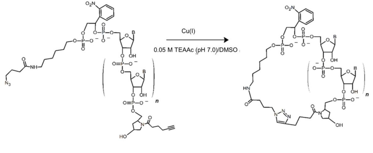 Таким образом получили серию олигорибонуклеотидов, содержащих азидогруппу на 5′-конце и алкиновую группировку на 3′-конце. Во всех случаях реакция проходила количественно, и для циклизации на следующей стадии использовали 5′,3′-модифицированные олигорибонуклеотиды без предварительного выделения.