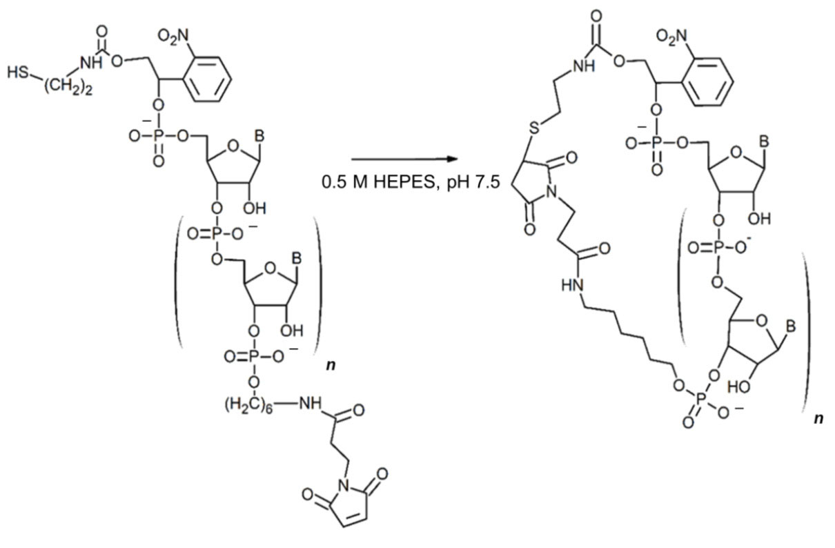 Затем дисульфидную связь восстанавливали с образованием сульфгидрильной группы (–SH) путем обработки 0.5 М раствором дитиотреитола (DTT). В результате получали олигорибонуклеотид, который содержал SH-группу на 5′-конце и малеимидную группу на 3′-конце. Реакционную смесь использовали для циклизации без проведения дополнительной очистки, т.к. в ней присутствовал единственный основной продукт реакции.
