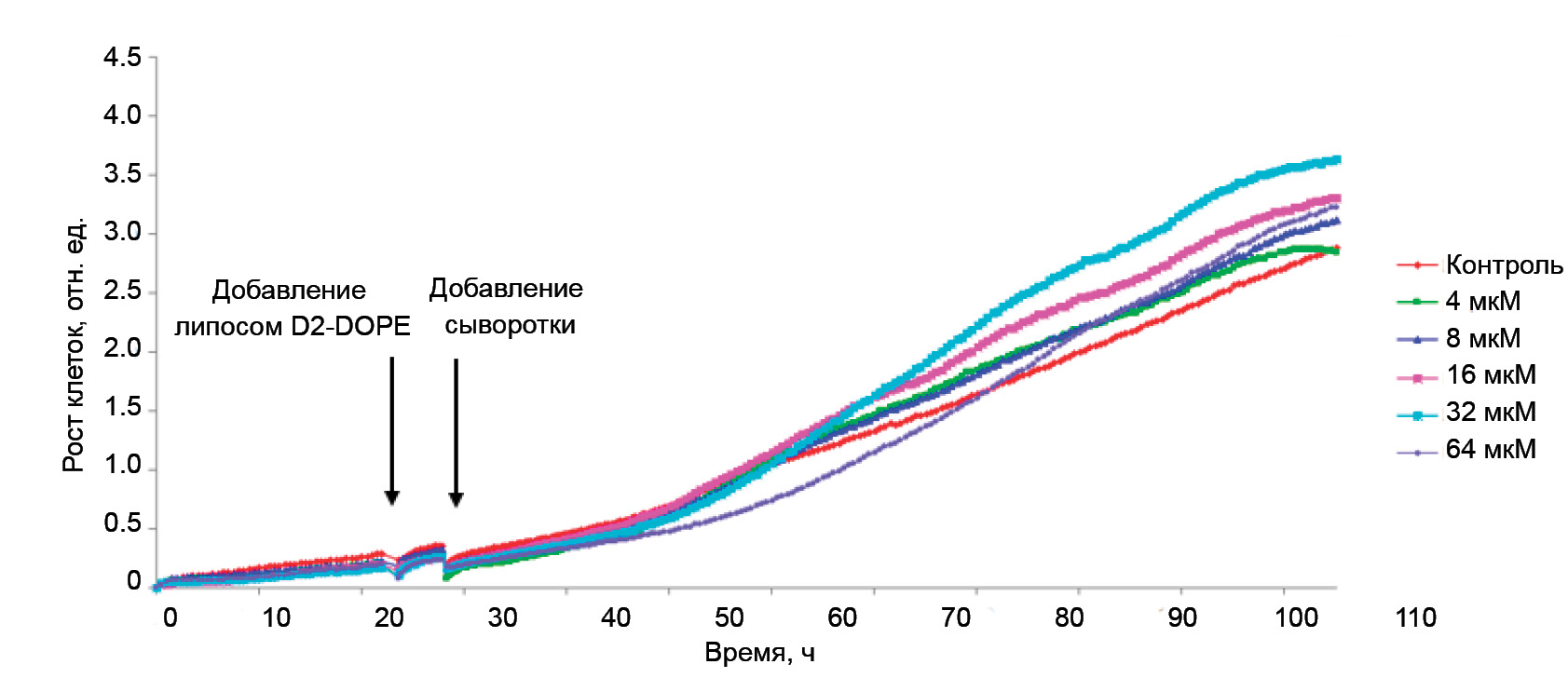 Жизнеспособность клеток НЕК 293 (при плотности посадки 5 × 103 клеток на лунку) в присутствии 4, 8, 16, 32 и 64 мкМ липосом D2-DOPE контролировали в режиме реального времени на приборе xCELLigence (ACEA Biosciences, США) в течение 90 ч.