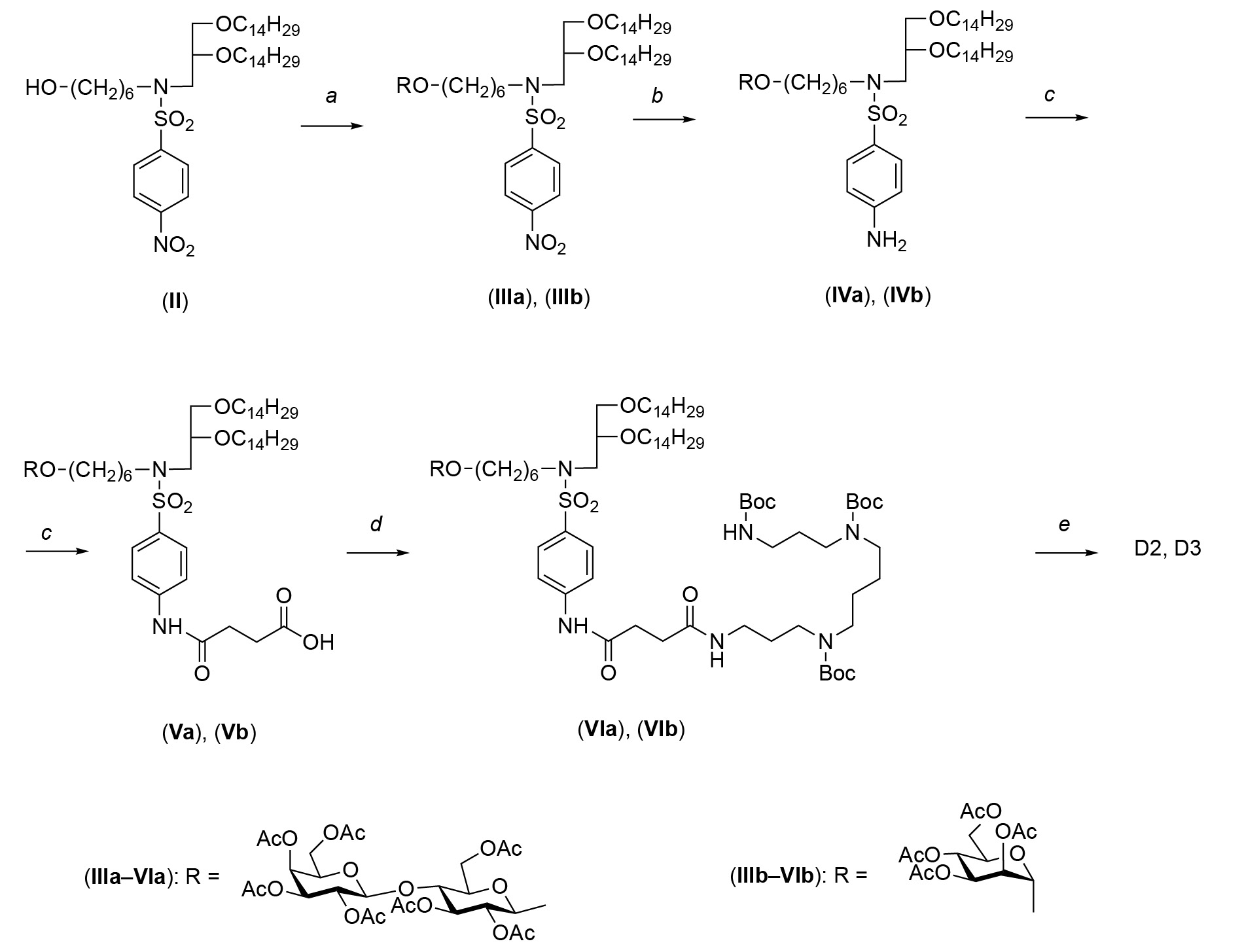 На завершающем этапе синтеза осуществляли удаление защитных групп в соединениях (VIa), (VIb), используя опережающее деблокирование аминогрупп, действием трифторуксусной кислоты. Во избежание деструкции ключевых амфифилов D2 и D3 удаление ацетильных групп осуществляли действием 0.04 н. раствора метилата натрия в метаноле с последующей обработкой реакционной смеси раствором 4 н. HCl в диоксане. Выделение углеводсодержащих катионных амфифилов D2 и D3 проводили с использованием обращенно-фазовой хроматографии на силикагеле (LiChroprep® RP-18 для D2 и YMC-Pack ODS-AQ 12S50 для D3) и дополнительного диализа против воды, что привело к получению амфифилов D2 и D3 с выходами 64 и 55% соответственно. Структура полученных целевых амфифилов D2 и D3 была подтверждена с помощью спектроскопии (1Н- и 13С-ЯМР) и масс-спектрометрии.