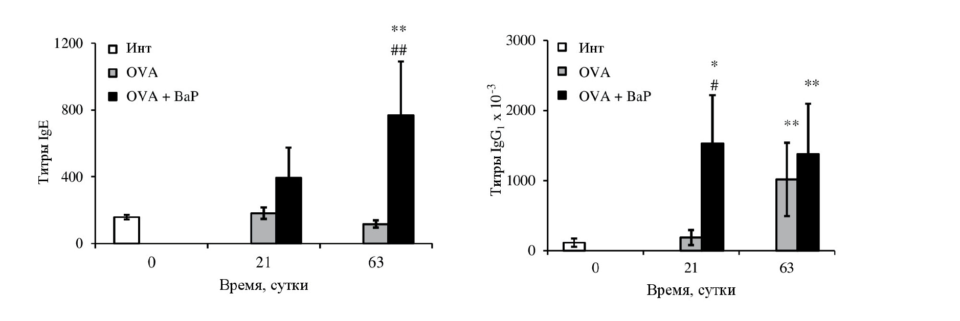 Согласно литературным данным, BaP как основной действующий компонент ЧДТ способен самостоятельно вызывать индукцию локального аллергического воспаления и продукцию аллерген-специфических антител [11–13]. В ходе данной работы нами было произведено многократное, дважды в неделю в течение 9 недель, интраназальное введение модельного антигена OVA в низкой (0.3 мкг) дозе в отсутствие и в присутствии 4 нг BaP. Действительно, согласно представленным на рис. 1 и табл. 1 данным, продукция OVA-специфических антител достоверно усиливалась под воздействием BaP. Продукция аллерген-специфических IgE формировалась только на позднем сроке (63-и сутки) и только при совместном введении антигена и BaP. В отсутствие поллютанта формирование продукции специфического IgE не отмечалось при сравнении с интактной группой (рис. 1а). В то же время продукция специфического IgG1 под действием BaP на позднем сроке формировалась со схожей интенсивностью в группах, иммунизированных как в присутствии BaP, так и без него. Однако на раннем сроке было отмечено достоверное стимулирующее воздействие BaP на продукцию антител данного субкласса (рис. 1б).