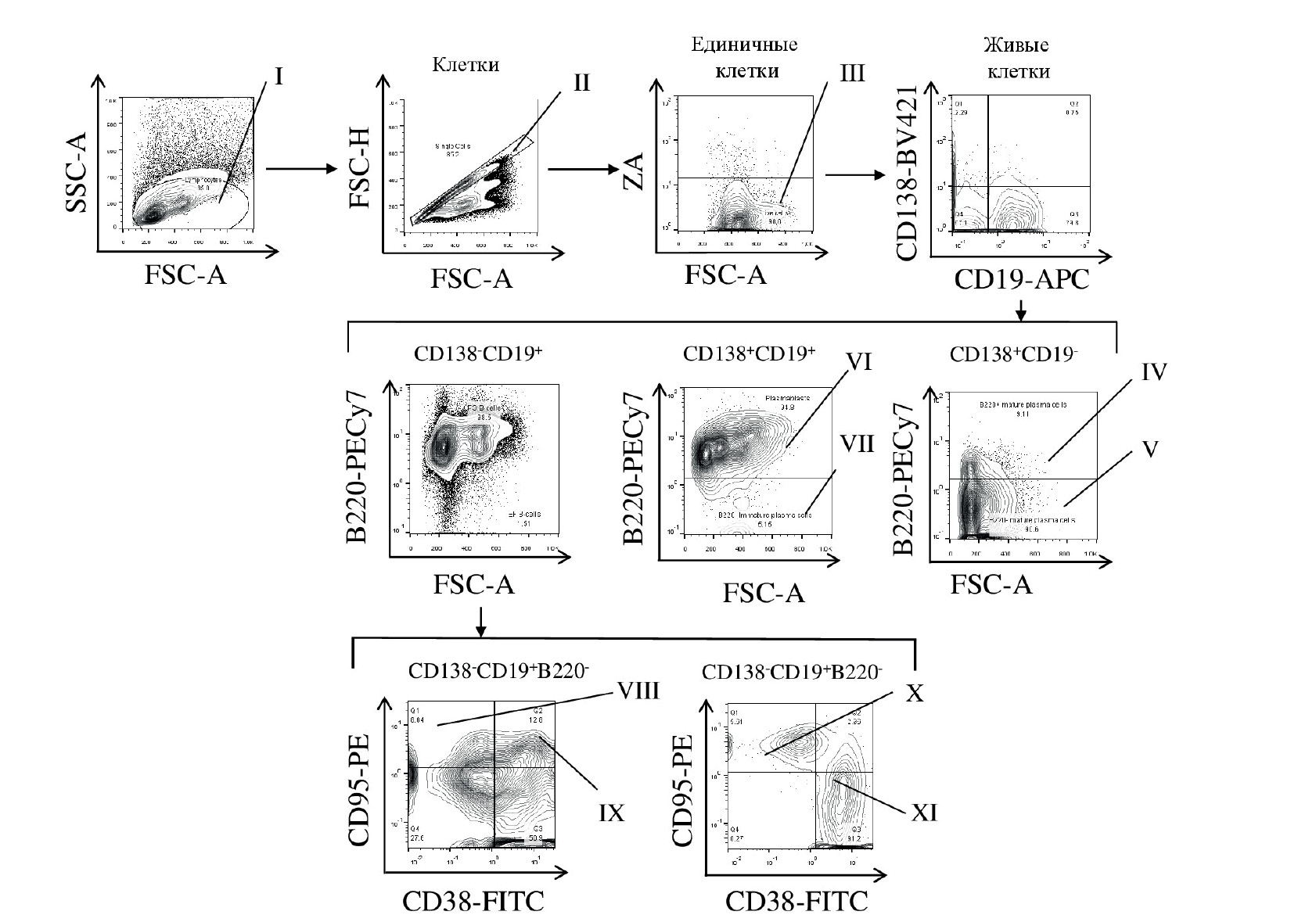 Рис. 2. Стратегия анализа субпопуляций В-лимфоцитов и плазматических клеток. Цифрами обозначены следующие субпопуляции, упомянутые в статье: I – лимфоидные клетки в целом; II – единичные клетки; III – живые клетки; IV – CD138+CD19–B220+ зрелые плазматические клетки; V – CD138+CD19–B220– зрелые плазматические клетки; VI – CD138+CD19+B220+ плазмабласты; VII – CD138+CD19+B220–CD19+ незрелые плазматические клетки; VIII – CD38–CD95+B220–CD19+ активированные плазмабласты экстрафолликулярного ответа; IX – CD38+CD95+B220–CD19+ активированные плазмабласты экстрафолликулярного ответа; X – CD38–СD95+B220+CD19+ В-лимфоциты герминальных центров; XI – CD38+СD95+B220+CD19+ предшественники В-лимфоцитов герминального центра.