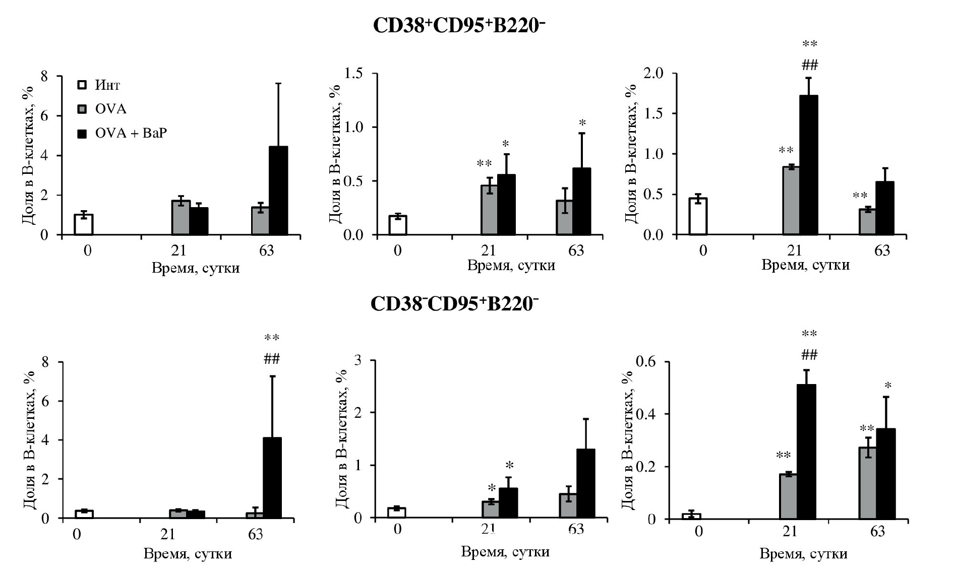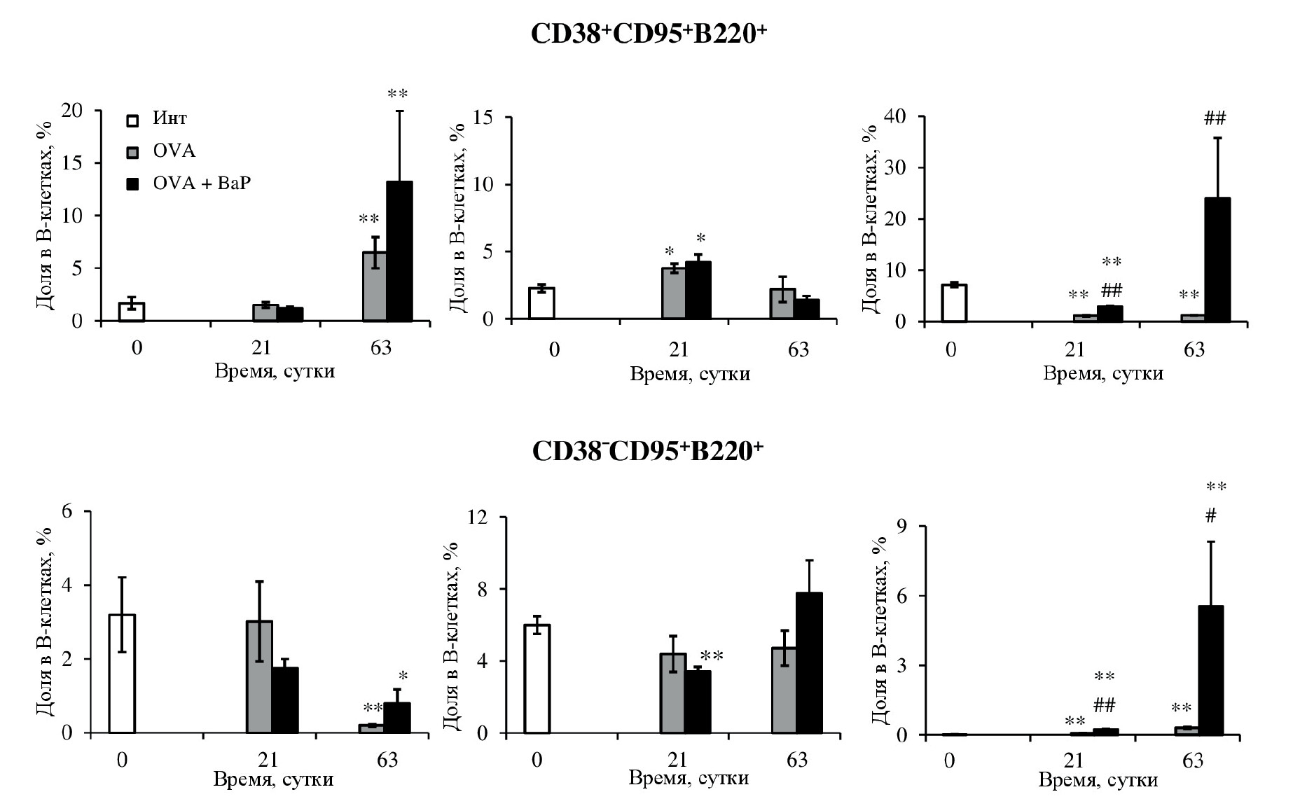 Интраназальное введение антигена в отсутствие дополнительных стимулов не оказывало влияния на изменение субпопуляционного состава и содержания активированных CD38–CD95+B220– и CD38+CD95+B220– плазмабластов [34] в общем пуле В-лимфоцитов легких (рис. 4а, 4г). Введение OVA достоверно повышало содержание этих клеток в региональных лимфатических узлах в образцах, взятых от животных на раннем сроке (рис. 4б, 4д). Кроме того, наблюдали достоверное увеличение содержания CD38–CD95+B220– плазмабластов на раннем и позднем сроках иммунизации в селезенке под действием антигена. В отношении CD38+CD95+B220+ плазмабластов селезенки подобное наблюдали на раннем сроке (рис. 4в, 4е). Введение BaP достоверно и заметно (в ~2–3 раза) повышало содержание субпопуляций активированных плазмабластов в селезенке, но не региональных лимфатических узлах, на раннем сроке (рис. 4в, 4е). В образцах легких, взятых у мышей на позднем сроке, когда происходило формирование продукции IgE, наблюдали повышение содержания активированных плазмабластов в ткани легких, которое было достоверно для CD38–CD95+B220– субпопуляции (рис. 4а, 4г). Хотя поллютант не оказал значительного влияния на накопление субпопуляций CD38+CD95+B220– плазмабластов в региональных лимфоузлах по сравнению с группами мышей, иммунизированных без него, именно в группах с поллютантом сохранилось их повышенное содержание, наблюдавшееся на всех сроках иммунизации по сравнению с интактными животными (рис. 4б). Полученные данные указывают на связь адъювантного воздействия BaP на продукцию специфического IgE, сформировавшуюся на позднем сроке, с накоплением экстрафолликулярно активированных плазмабластов локально, в ткани легких. Также существовала связь между адъювантным влиянием на продукцию специфического IgG1 на раннем сроке иммунизации с усилением накопления под влиянием BaP экстрафолликулярно активированных плазмабластов в селезенке на том же сроке.