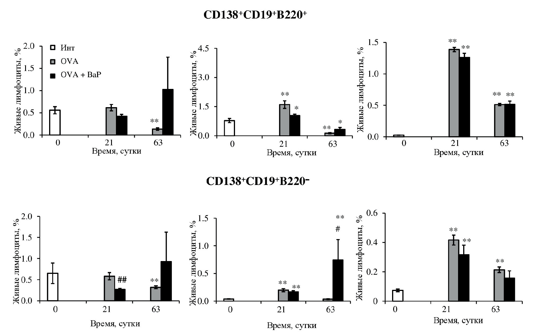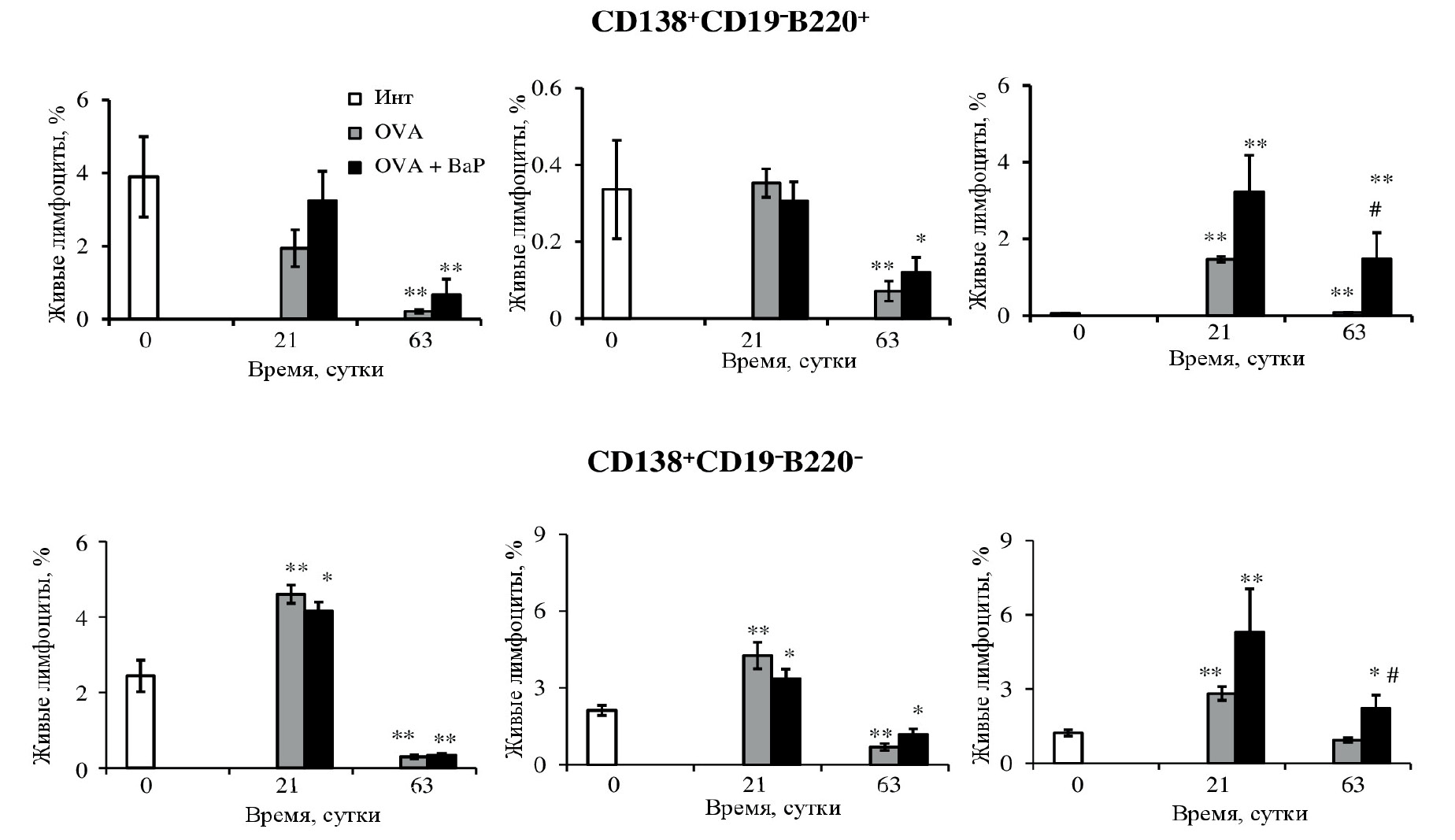На сегодняшний день в литературе нет информации об исследованиях, в которых анализировалась бы связь продукции IgE, индуцируемой аэрополлютантами, с содержанием разных В-лимфоцитарных субпопуляций локально, в месте попадания аллергена, и системно, во вторичных лимфоидных органах. Целью настоящей работы было по возможности устранить данный пробел и определить связь адъювантного эффекта BaP с содержанием различных В-клеточных субпопуляций в месте попадания аллергена (ткани легких), лимфатических узлах и селезенке.