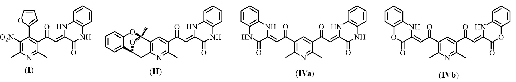 У ряда производных (соединения (I), (II)) в опытах in vitro были выявлены выраженные и умеренные противотуберкулезные, антибактериальные и противогрибковые свойства [14, 15]. Одно из производных с линкерным 3,4-дигидрохиноксалин-2-оновым заместителем (II) в тестах in vitro проявило выраженную противовирусную активность, подавляя рост микобактерий и репликацию вируса SARS-CoV-2 [16]. Кроме того, синтезированные на основе 3,5-диацетил-2,6-диметилпиридина (IIIa) производные бис(3,4-дигидрохиноксалин-2-она) (IVa) и бис(3,4-дигидро-2H-1,4-бензоксазин-2-она) (IVb) (схема 1) в результате биоскрининга in vivo на модели уксусных корчей показали анальгетическую активность, превосходящую активность препарата сравнения – анальгина [17, 18]. Для дальнейшего исследования биологической активности наиболее перспективных биспроизводных (IVa) и (IVb) необходимо изучить их токсичность.