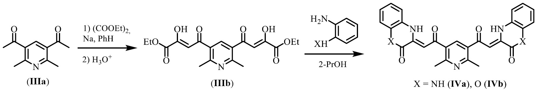 Общая методика синтеза исследуемых соединений (IVa) и (IVb) [17]. Смесь 2.5 г (6.5 ммоль) диэтил-(2Z,2'Z)-4,4'-(2,6-диметилпиридин-3,5-диил)-бис(2-гидрокси-4-оксобут-2-еноата) (IIIb) и 1.4 г (13 ммоль) о-фенилендиамина или о-аминофенола в 50 мл 2-пропанола кипятили при перемешивании в течение 3 ч. Раствор с выпавшим осадком охлаждали, отфильтровывали, осадок промывали 2-пропанолом и перекристаллизовывали из смеси 2-пропанол–хлороформ.