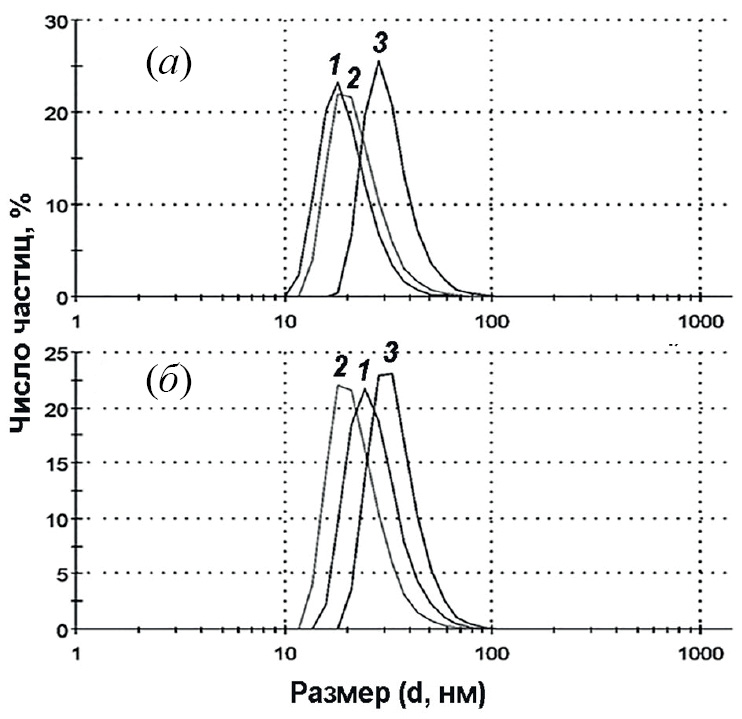 3. Fig. 2. Particle size distribution according to DLS data 1–2 h (a) and 3 months (b) after sample preparation. 1 – Ans, 2 – Ans/PL, 3 – Ans/PL-ODN. Concentration of particles and nanocomposites – 0.1 mg/ml based on Ans.