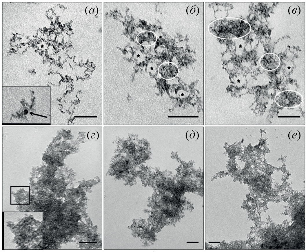 4. Fig. 3. Ultrastructure of Ans, Ans/PL, and Ans/PL•ODN nanoparticle suspensions obtained by TEM: (a) – aqueous suspension of Ans nanoparticles. Inset – particles of medium electron density, rounded electron-dense particle is shown by arrow; (b) and (c) – aqueous suspensions of Ans/PL and Ans/PL•ODN nanoparticles. Cavities of closed rounded profiles are shown by asterisks. Areas of dense arrangement of nanoparticles are highlighted by circles; (d) – suspension of Ans nanoparticles in 0.9% NaCl solution. Inset shows enlarged area of ​​accumulation, “glued” particles are visible; (d) and (e) – suspensions of Ans/PL and Ans/PL•ODN nanoparticles. Sorption of suspension on mesh. Length of scale bars is 100 nm.
