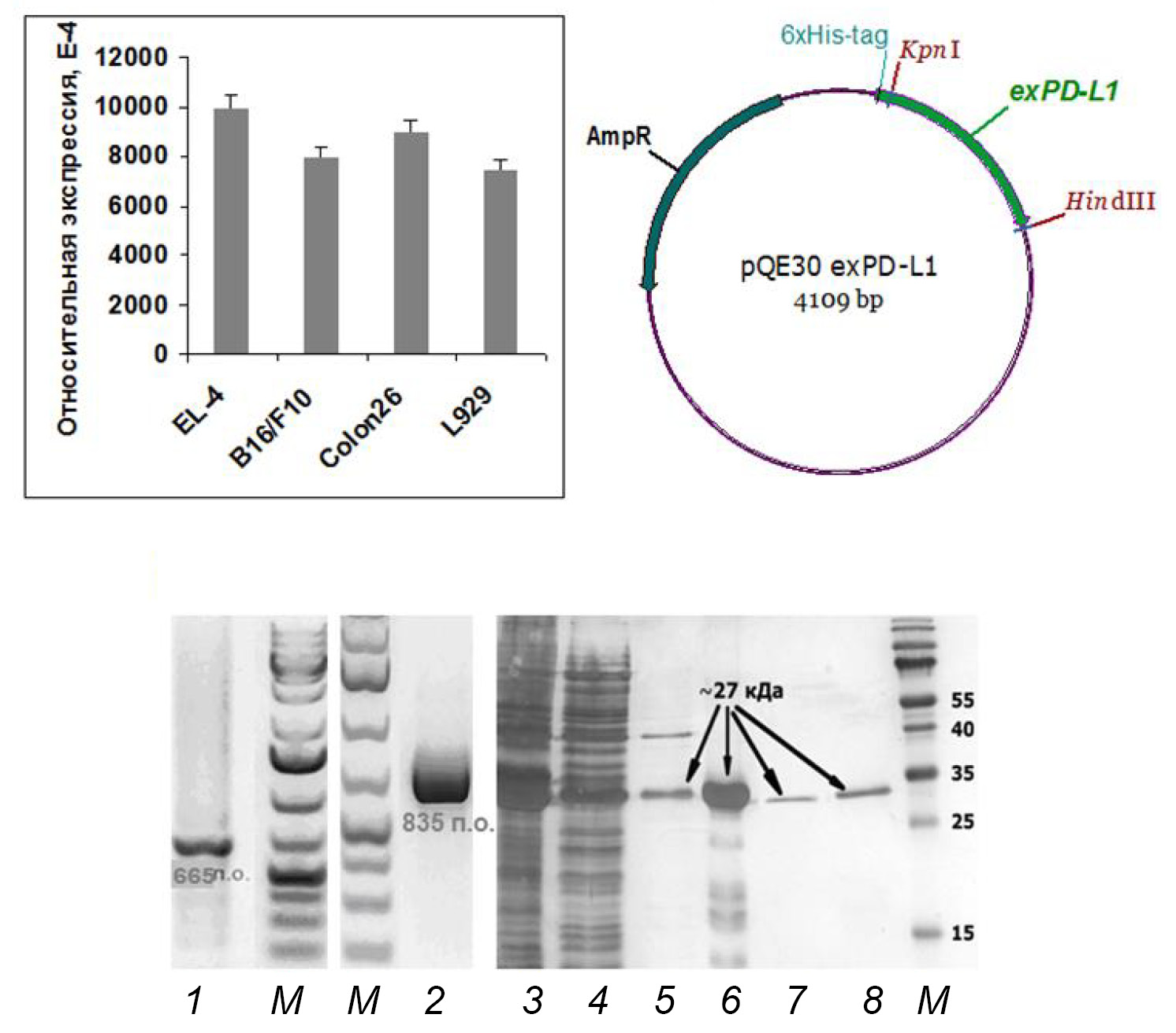Рис. 1. Экспрессия белка exPD-L1. (а) – Анализ экспрессии гена exPD-L1 в линиях клеток мышей; (б) – схема экспрессионного вектора pQE30, включающего ген белка exPD-L1; (в) – электрофореграмма результатов ПЦР фрагмента гена, кодирующего exPD-L1 до клонирования (1) и после встраивания в промежуточную плазмиду pTZ57R/T (2); (г) – электрофореграмма результатов выделения и очистки белка exPD-L1. (3) – лизат E. coli, который наносили на колонку с Ni-NTA агарозой; (4) – проскок с колонки; (5) – фракция промывки колонки от неспецифично связавшихся белков; (6) – фракция элюции (помимо целевого белка видны продукты его деградации); (7) – образец раствора белка после проведения обращенно-фазовой хроматографии; (8) – образец раствора белка после проведения рефолдинга белка и его диализа; M – маркер молекулярного веса белков и ДНК.